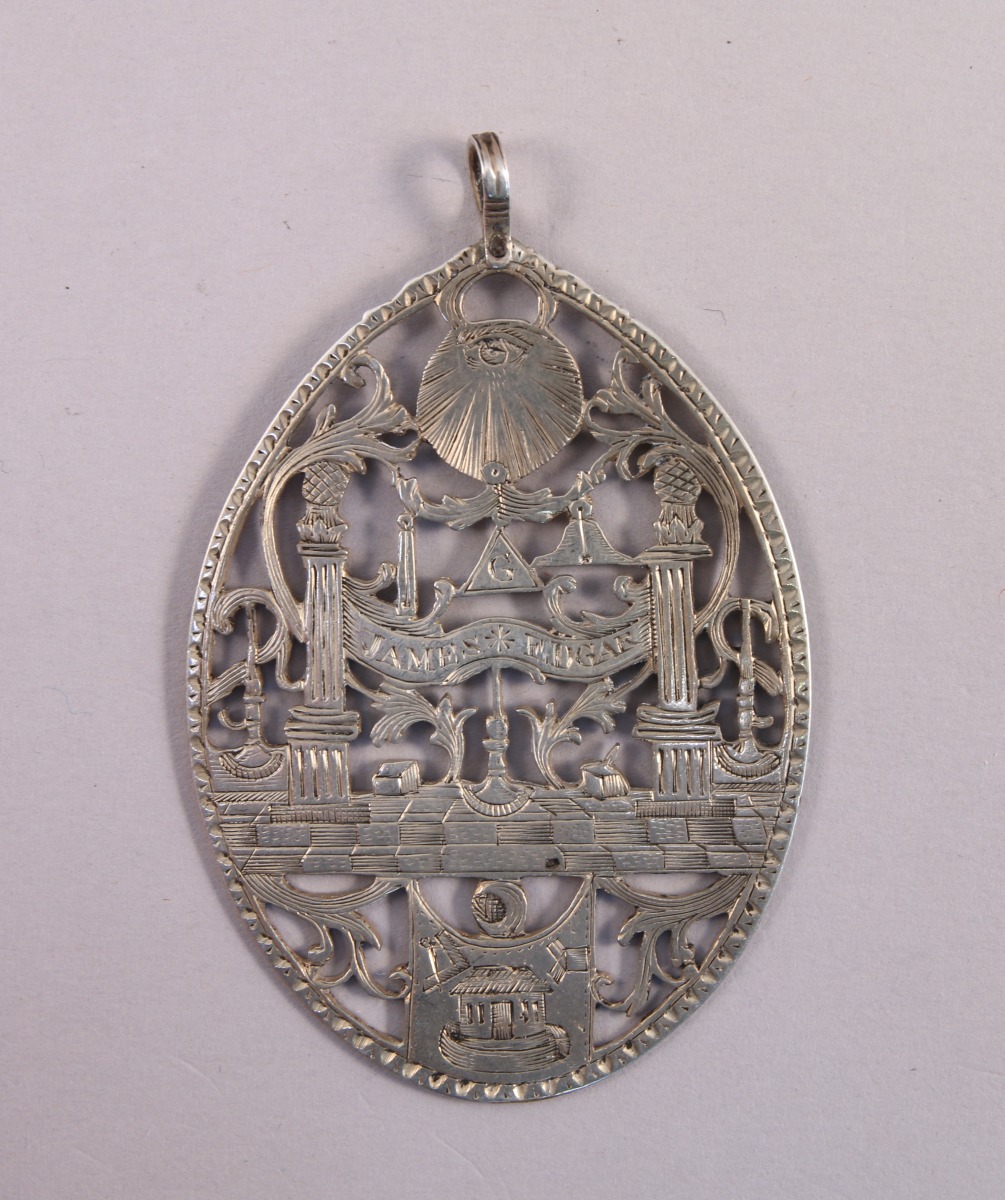 FRANC-MAÇONNERIE. PENDENTIF de forme ovale en argent finement ciselé et ajouré d'attributs maçonniques dans des rinceaux. Inscription "Sit lux et lux fuit / James * Edgar".