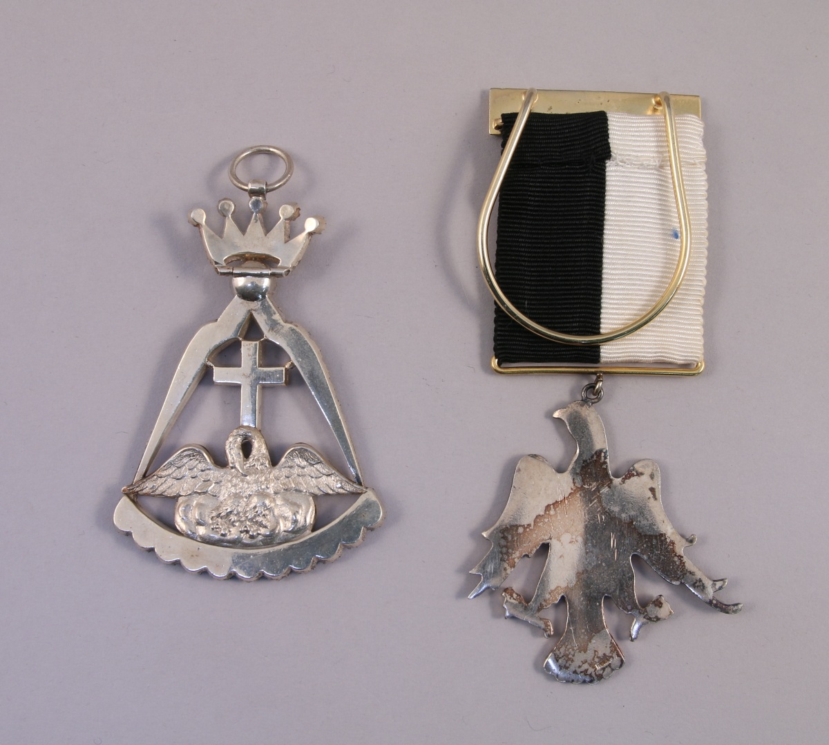 - BIJOU de la loge Villard de Honnecourt n°81 figurant un aigle chargé d'un pentagramme retenu par un ruban blanc et noir. Haut. 11, Larg. 5 cm.