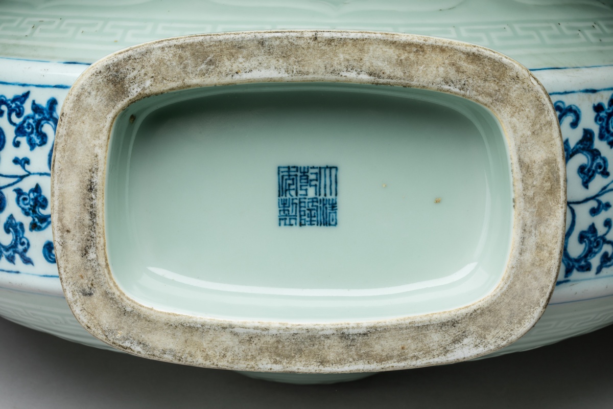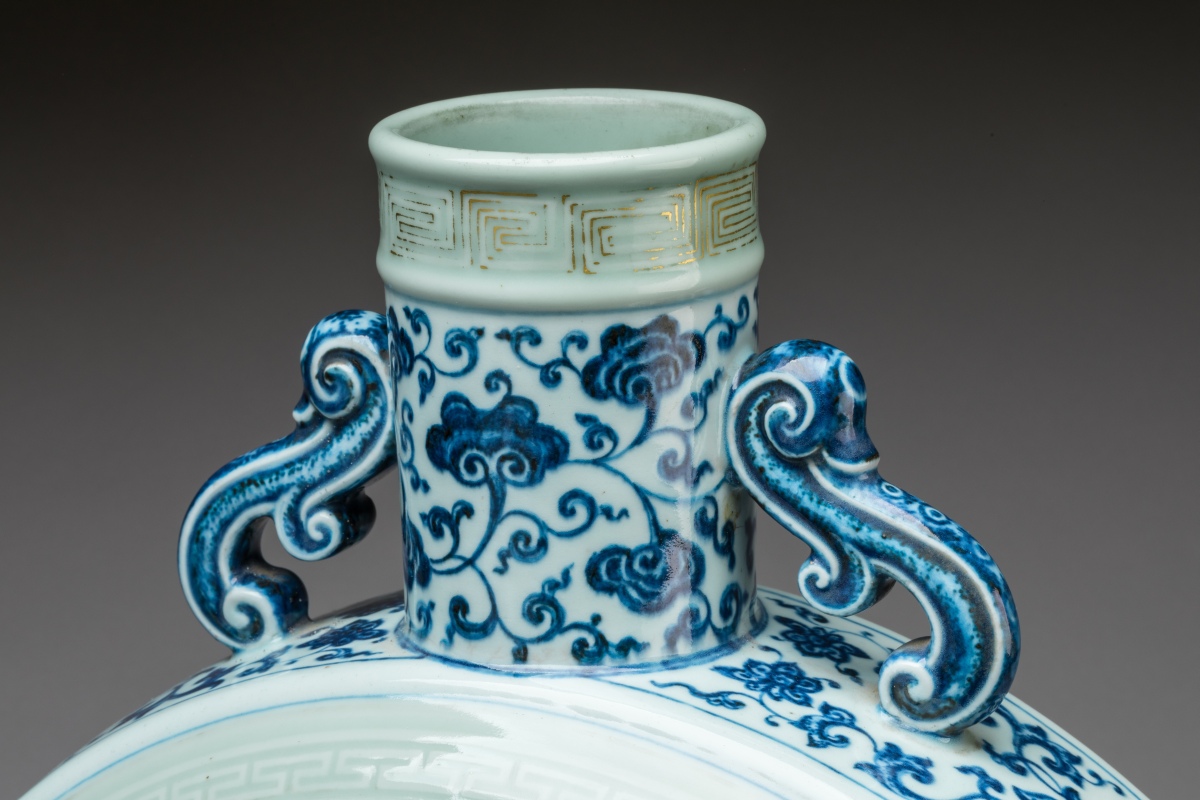 CHINA, QIANLONG period. A rare blue, white and celadon porcelain 'Baoyueping MOONFLASK'. Qianlong six-character seal mark in zhuanshu script on the base.