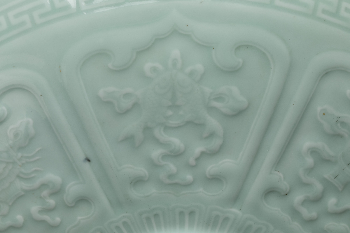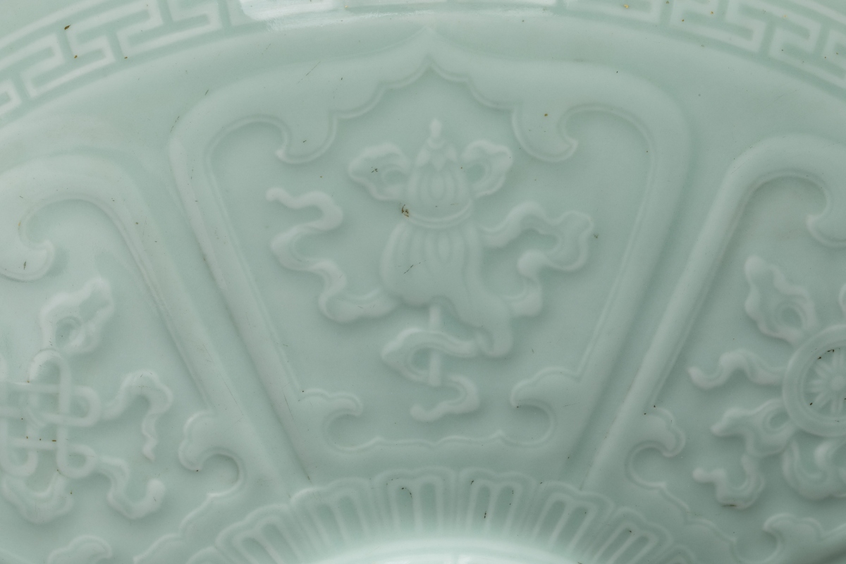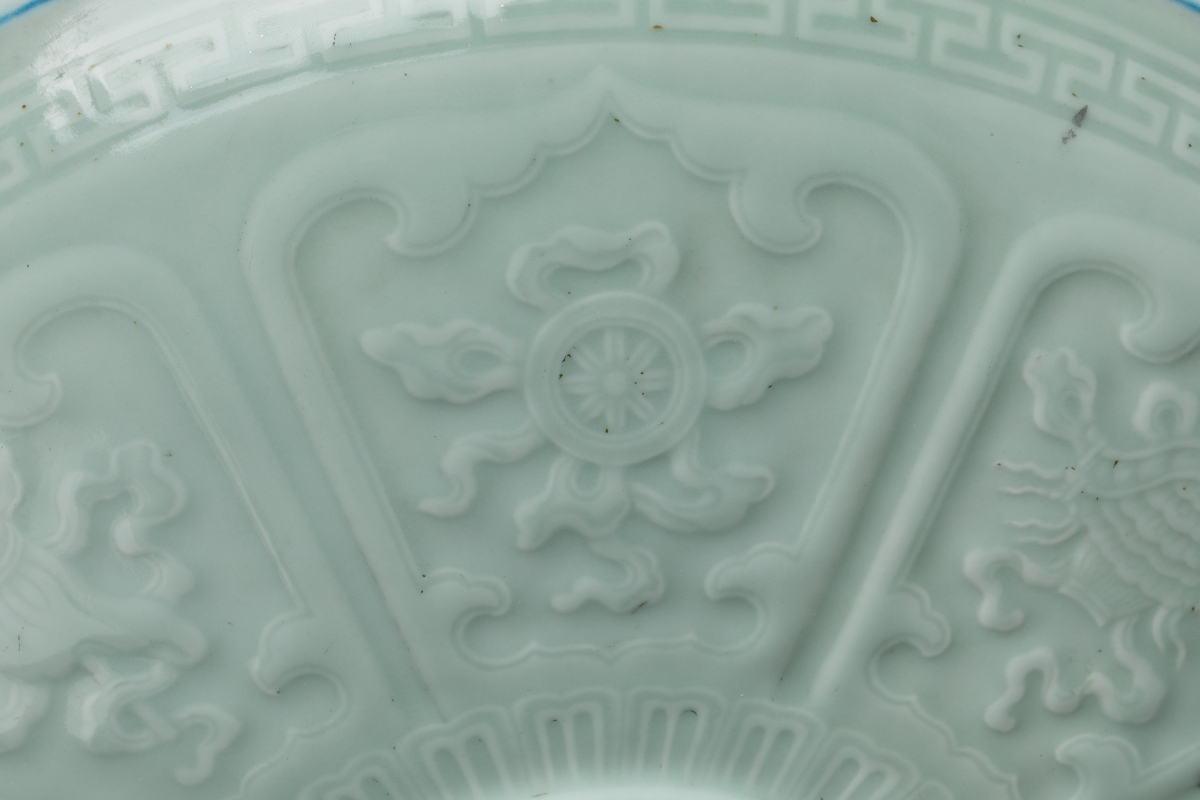 La panse à décor moulé sous la couverte des huit symboles bouddhiques (bajixiang) dans des pétales de lotus stylisées: la roue du dharma (connaissance), la conque (voix de bouddha), la bannière de victoire (bataille victorieuse de l'enseignement de bouddha sur tous les obstacles), le dais (protection et puissance spirituelle), la fleur de lotus (pureté et illumination), le vase précieux (richesse), la paire de poisson (bonheur conjugal), le nud sans fin (harmonie) ; ils forment une roue autour d'un médaillon central. La bordure de la panse ornée d'une frise de grecques. Les côtés en bleu blanc à décor de deux lotus et deux pivoines dans leur feuillage sur chaque côté ; le col, les anses et le talon ornés de fleurs stylisées dans leur feuillage. Les anses en forme de lingzhi. La bordure supérieure du col et le talon émaillés céladon et rehaussés à l'or (probablement postérieur) de grecques.
