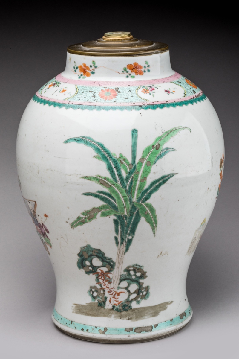 décorée en émaux polychromes de la famille rose de jeunes femmes et enfants jouant. L'épaulement orné d'une frise de motifs géométriques turquoises et en réserve de fleurs.
