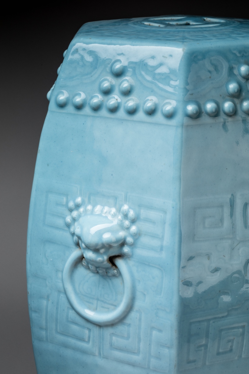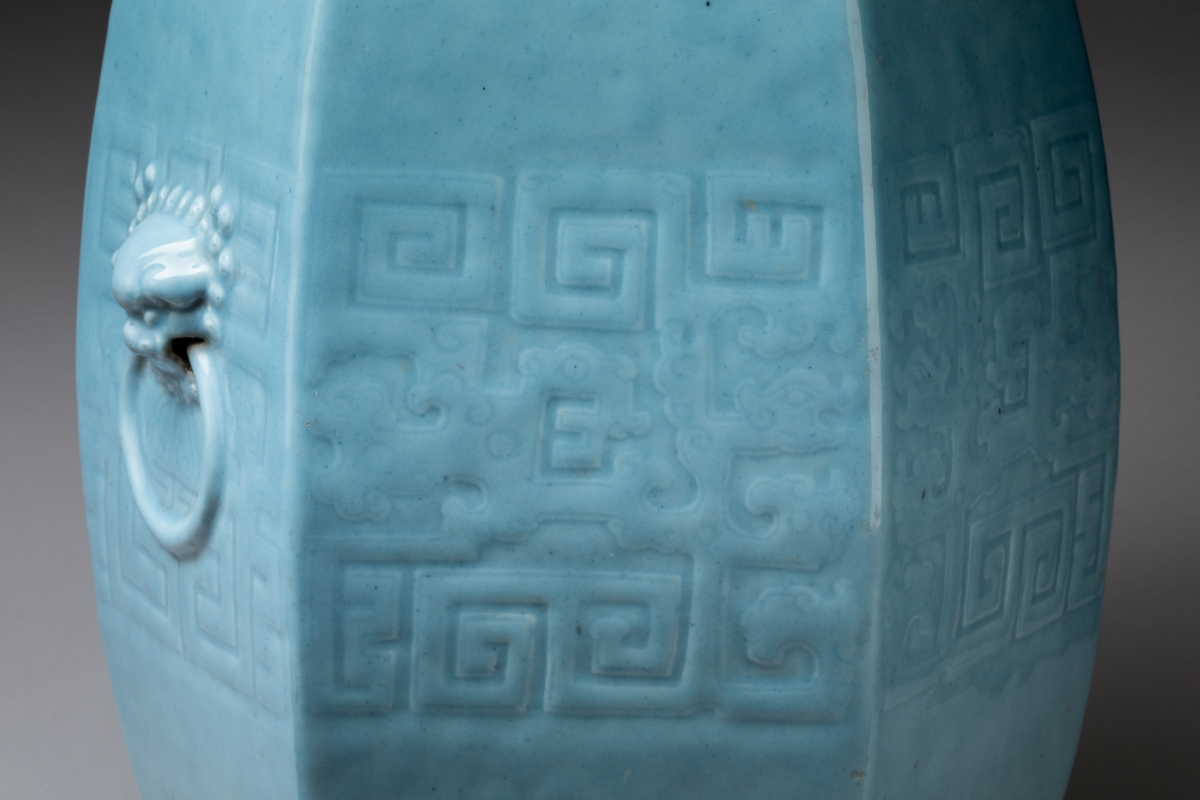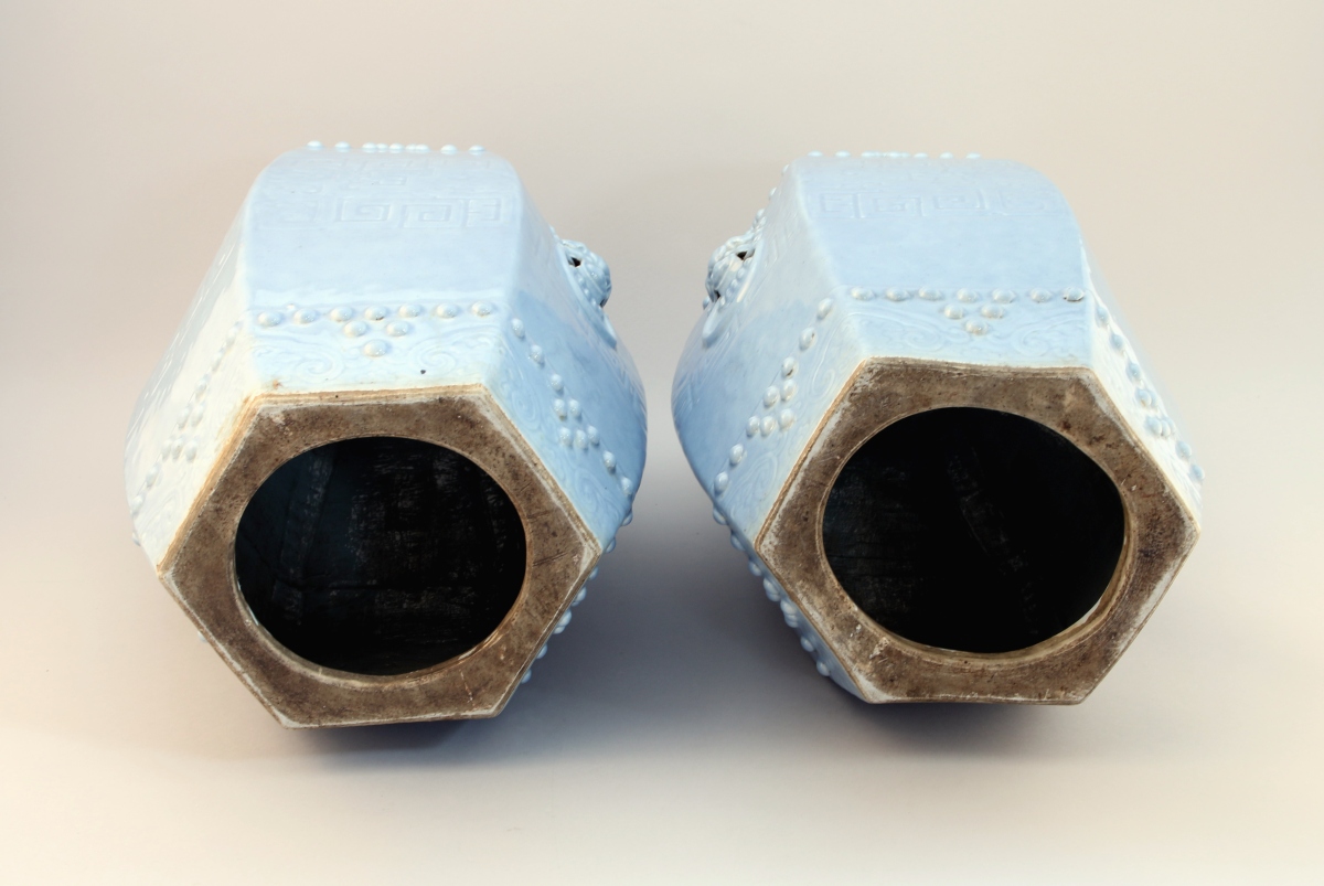 Paire de TABOURETS hexagonaux TONNELETS en porcelaine émaillée bleu "clair de lune" à décor incisé sous couverte de grecques et motifs de ruyi, des clous et les anses en forme de tête de chimère supportant des anneaux figurés en relief, l'assise ajourée d'un motif géométrique.