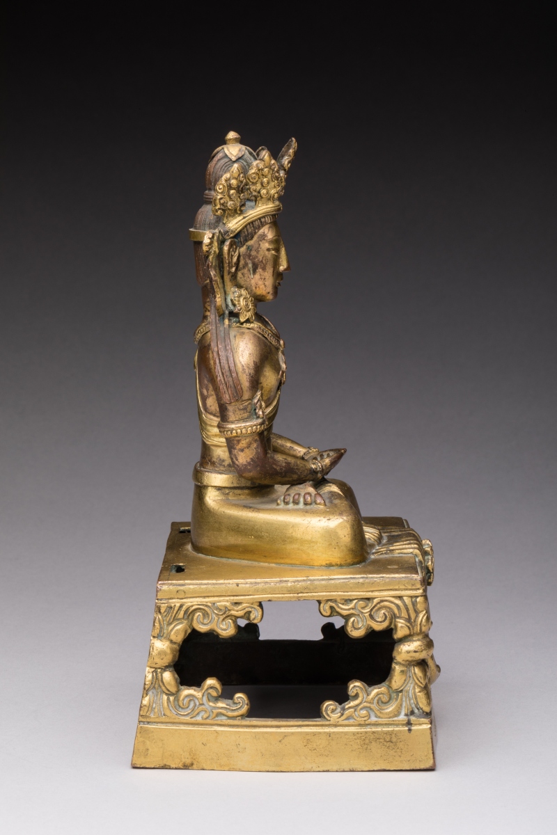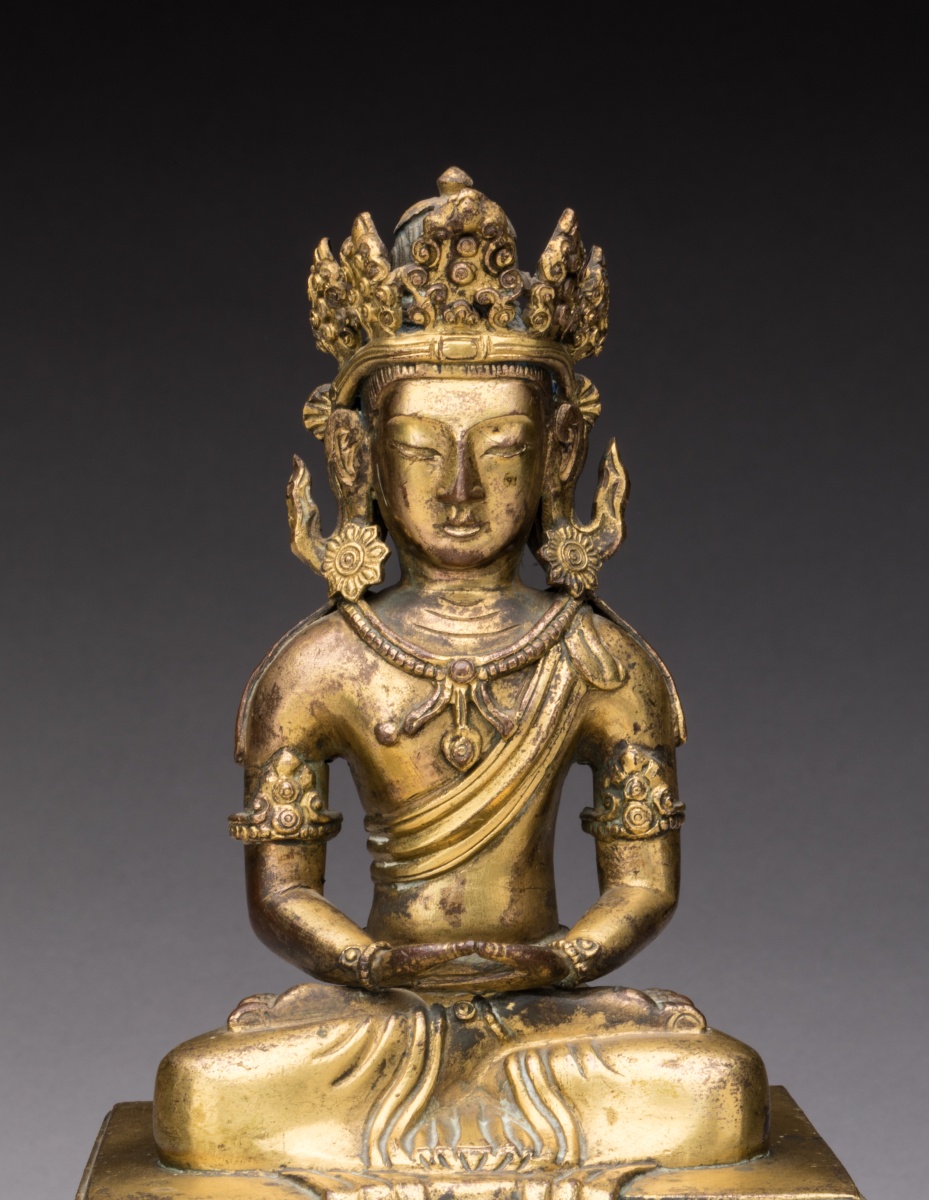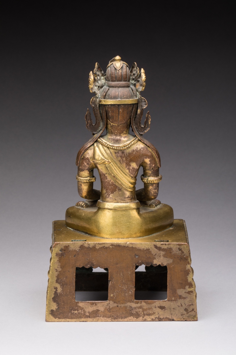 assis en padmasana sur une base quadrangulaire ajourée, les mains en dhyana mudra, la tête coiffée d'un diadème de cinq mandorles, symbole des cinq vainqueurs, des fleurs de lotus pendant aux oreilles, le buste et les bras ornés de bijoux, la robe plissée dont le drapé se prolonge sur l'avant du socle.