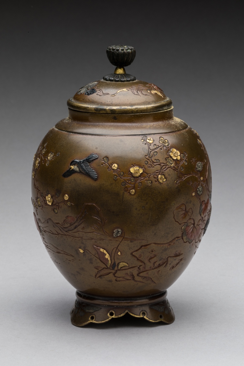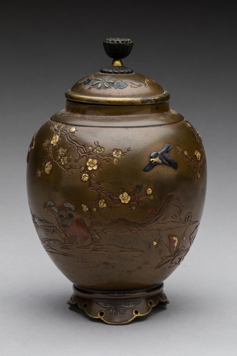 JAPAN, MEIJI period. Brown patinated bronze COVER POT. Illegible signature.