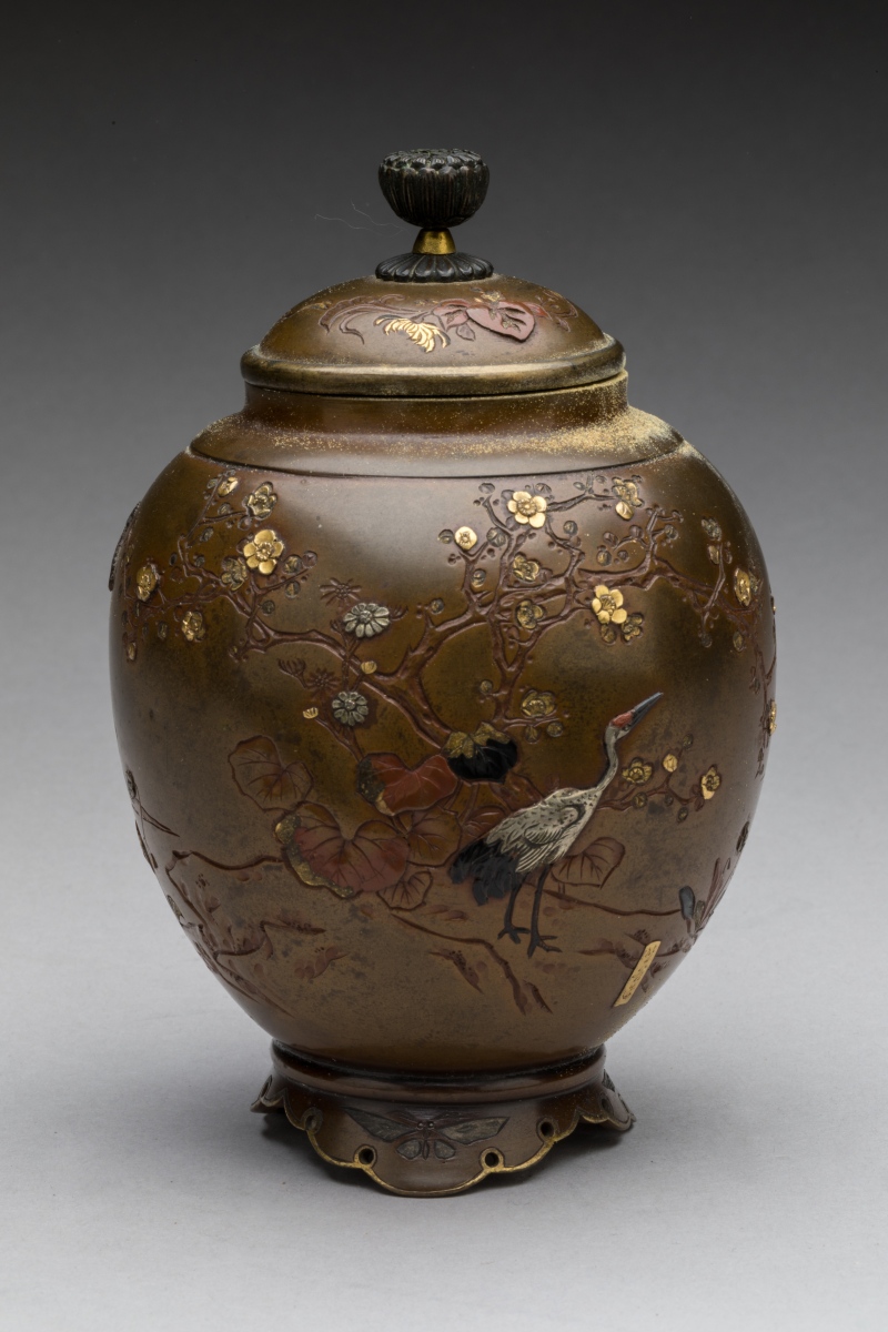à patine brune à décor incrusté de cuivre doré et shibuichi d'une grue et chidori parmi les cerisiers en fleurs.