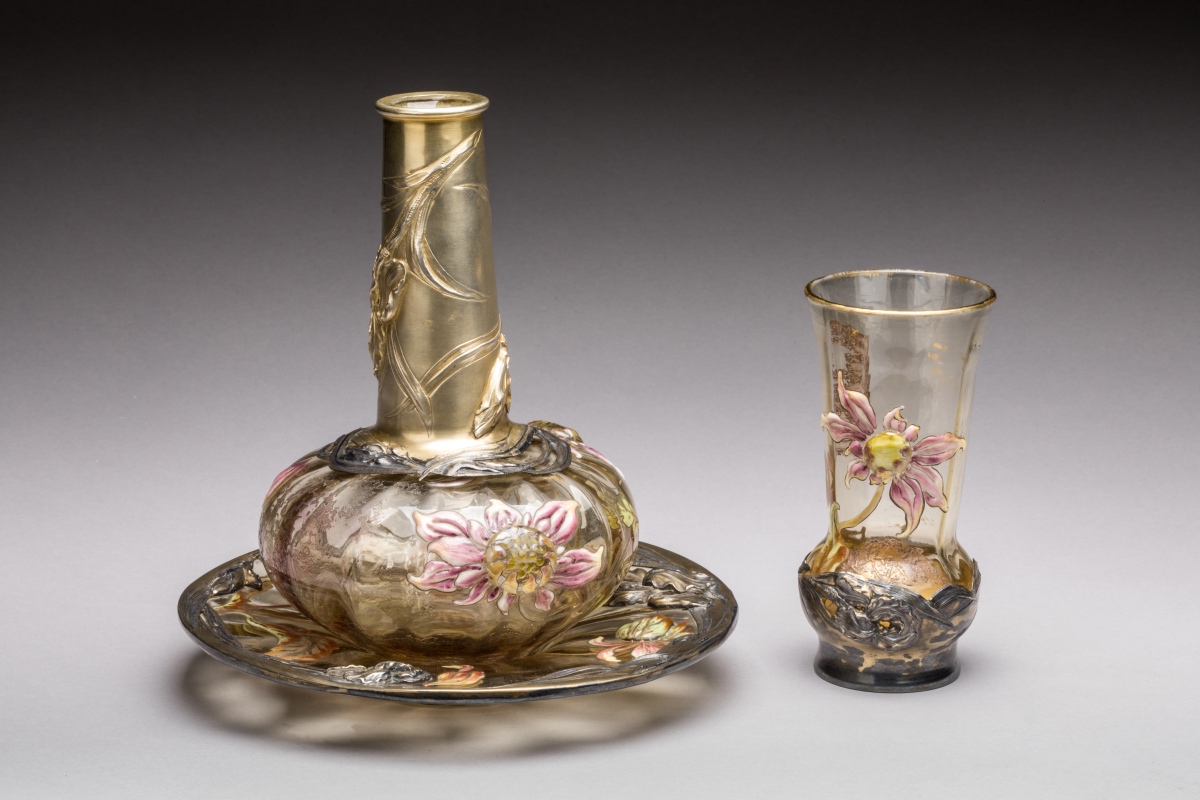 en verre émaillé et gravé composé d'un verre d'eau, d'une carafe et d'une soucoupe. Le verre ambré est décoré de dahlias en émaux peints opaques et translucides, le centre des capitules est en cabochon d'émail. Les feuilles sont gravées en creux à l'acide et émaillées d'or. Taches d'or appliquées au tampon. Monture de trois pièces en vermeil repoussé d'iris.