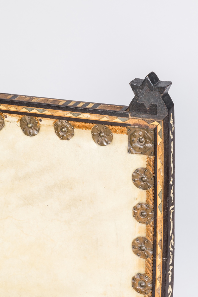 Fauteuil au dossier et à l'assise rectangulaires, gainés de parchemin et ceinturés de motifs circulaires en cuivre. Montants en bois teinté noir et piètement en compas à incrustations de motifs graphiques en nacre et ornementations de cuivre repoussé.