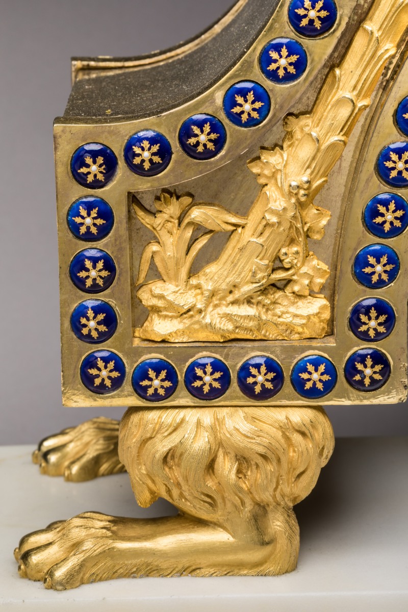 L'ensemble surmonte une arche décorée de feuillages à l'oiseau picoreur en bronze ciselé et doré. Les pastilles d'ornementation à fond bleu nuit et or de la base nous font penser à un travail du grand émailleur Coteau. L'arcature repose sur quatre pieds en jarrets de félins fixés sur un socle de marbre blanc supporté par quatre pieds toupie. Le balancier est décoré d'une scène ajourée de cortège de bacchanale encadrée de pampres de vigne et sommée de deux papillons.