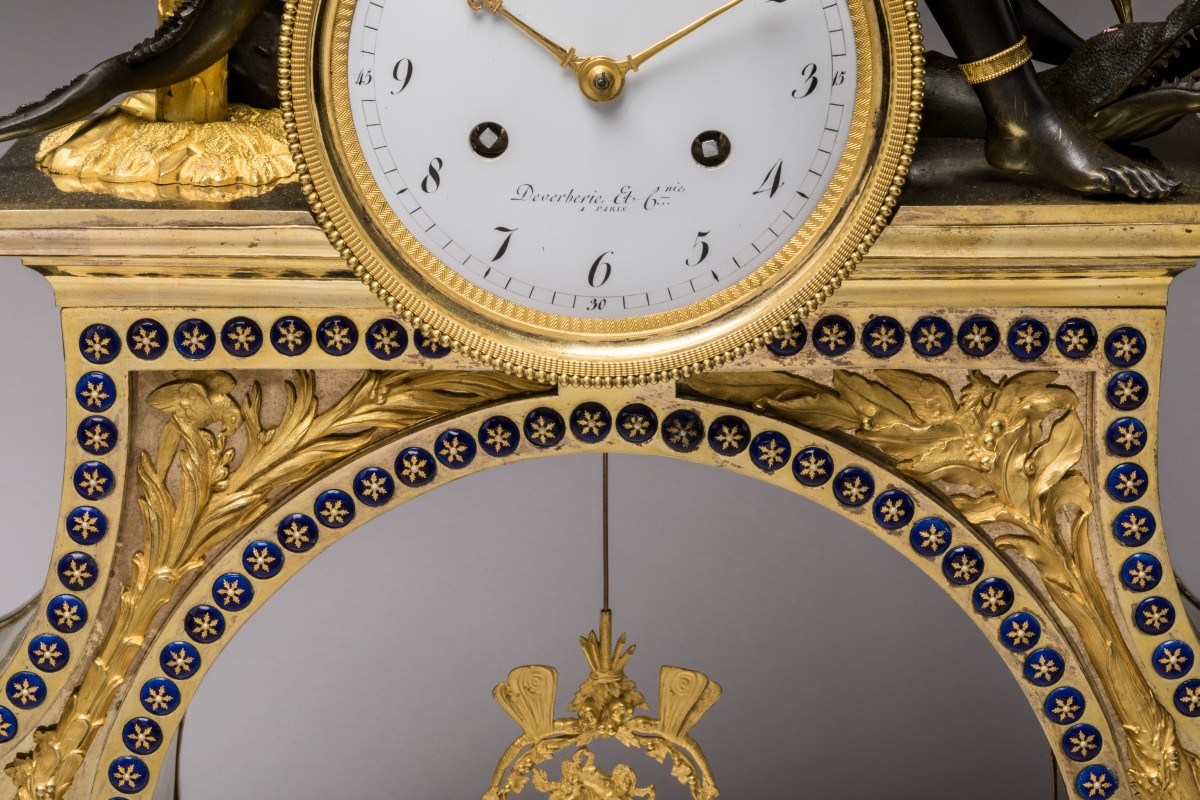 Cette pendule est à notre connaissance le seul luxueux grand modèle signé par Deverberie identifié aujourd'hui. Un exemplaire semblable, mais au cadran signé "Aubineau à Strasbourg", a été vendu chez Christie's (vente à New York le 18 mai 1989, n°33). Des pendules similaires mais au socle différent sont visibles dans des collections publiques: