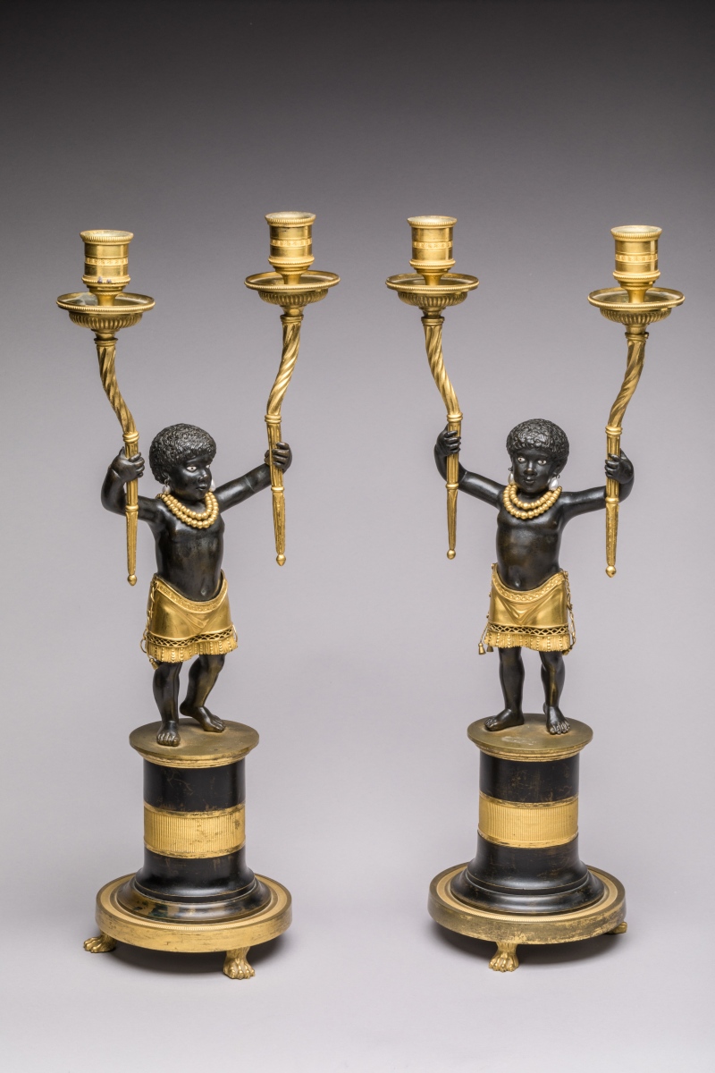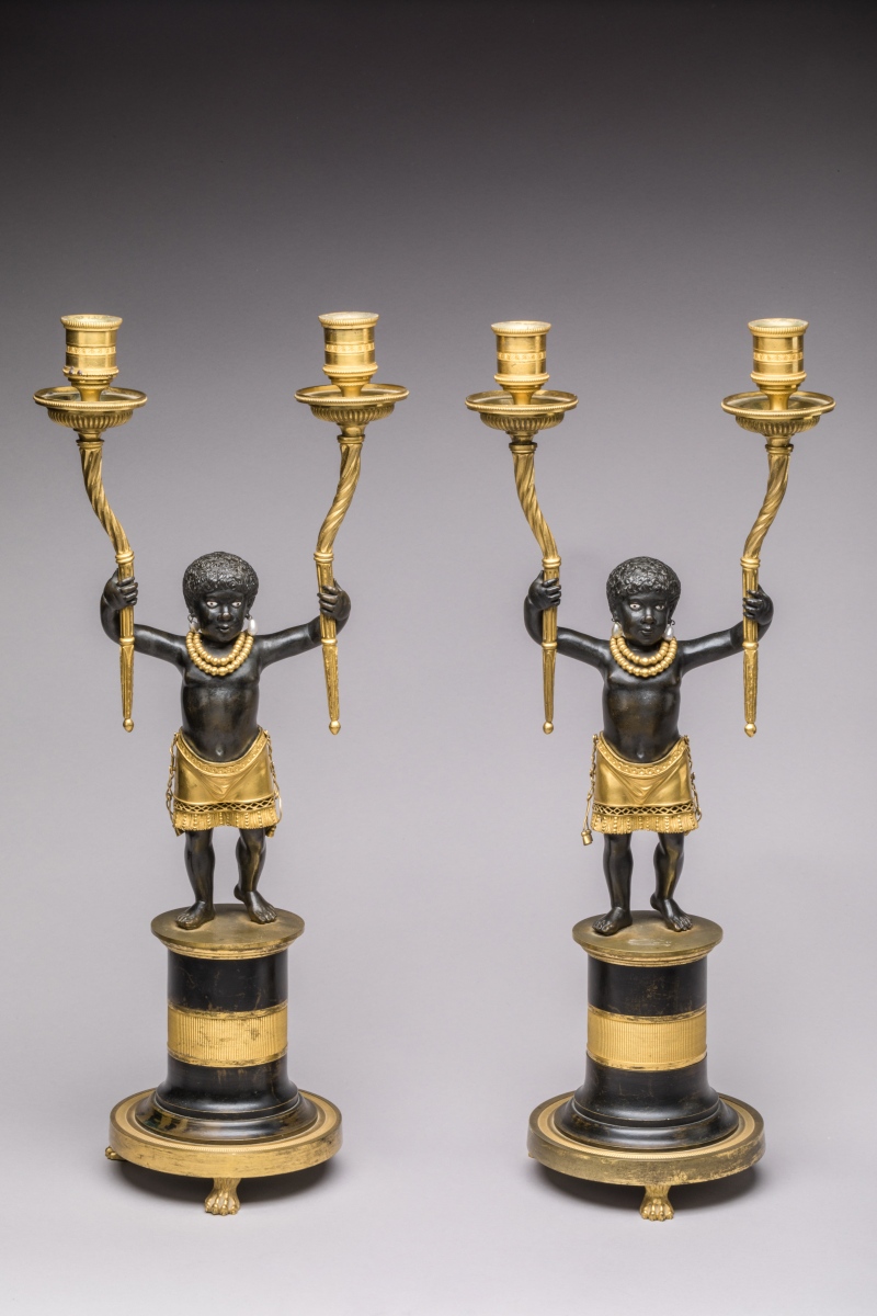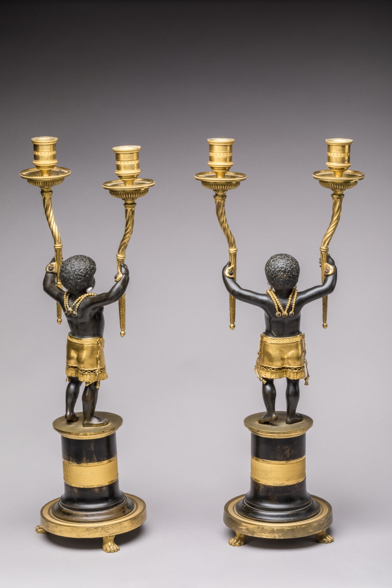 Paire de CANDÉLABRES "aux NÈGRES" en bronze patiné et doré.