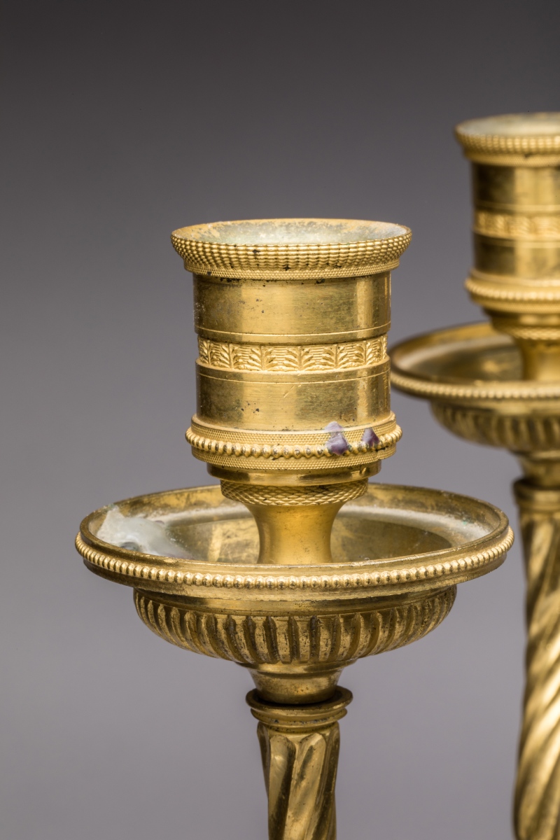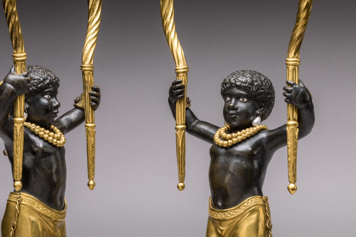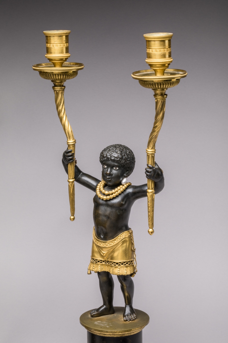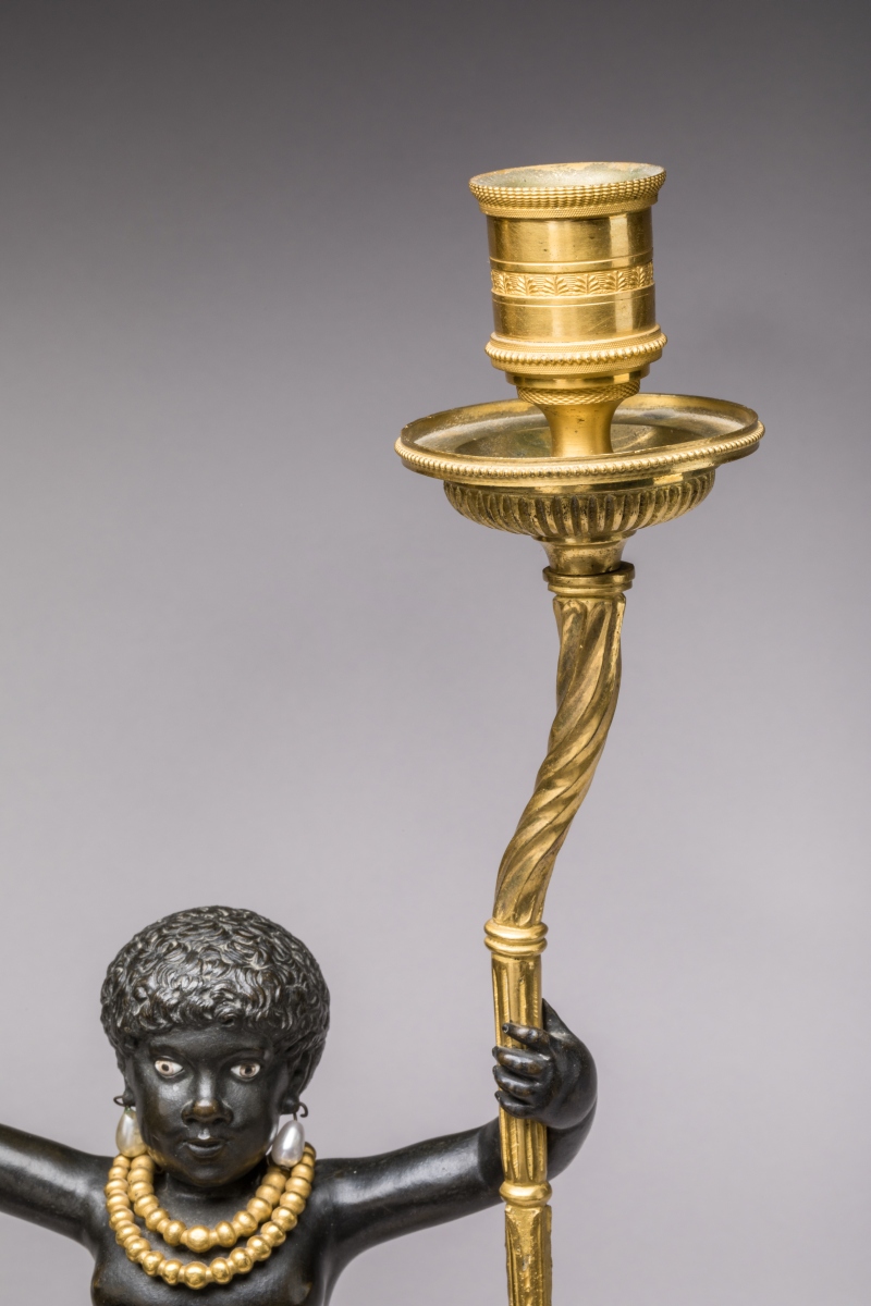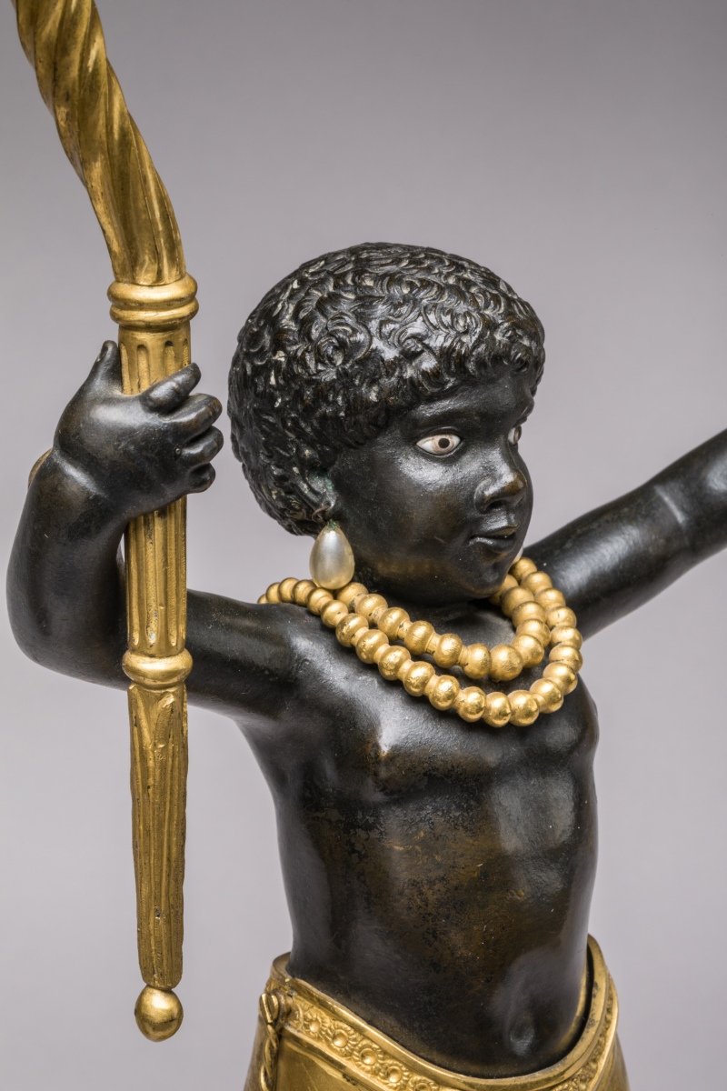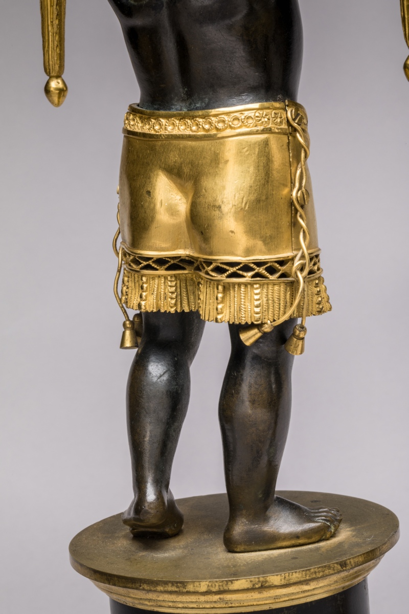 Les "NÉGRILLONS" soutiennent chacun deux bras de lumière en forme de cornes d'abondance. Ils sont vêtus d'un pagne à franges et parés d'un collier de perles en bronze doré, leurs oreilles sont percées et sont ornées de perles en verre émaillé. Ils reposent sur un socle imitant le fût d'une colonne dorique baguée, le tout porté par des pieds en jarrets de félins.