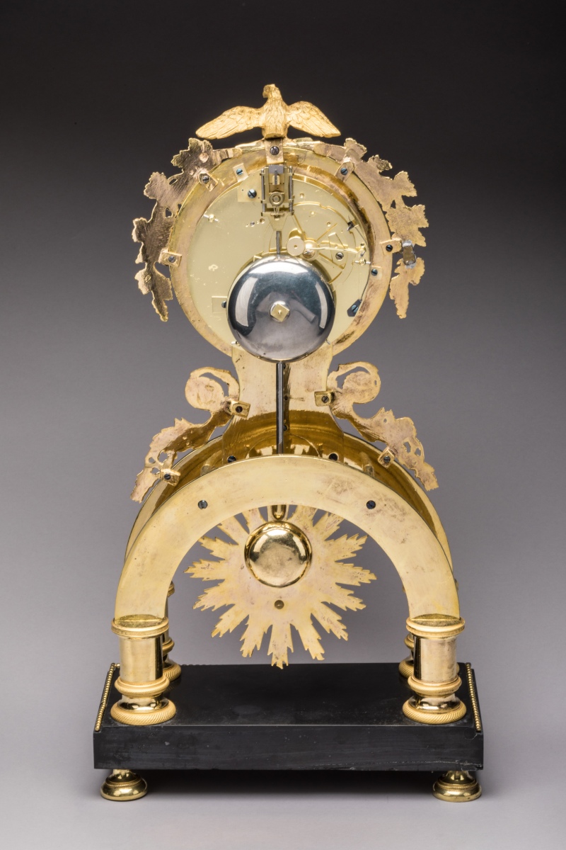 A Directoire gilt bronze ARCH SKELETON MANTEL CLOCK, signed MILLÉ, Orléans, on the dial.