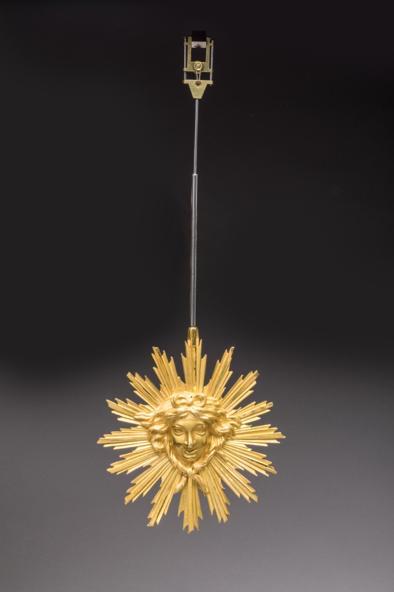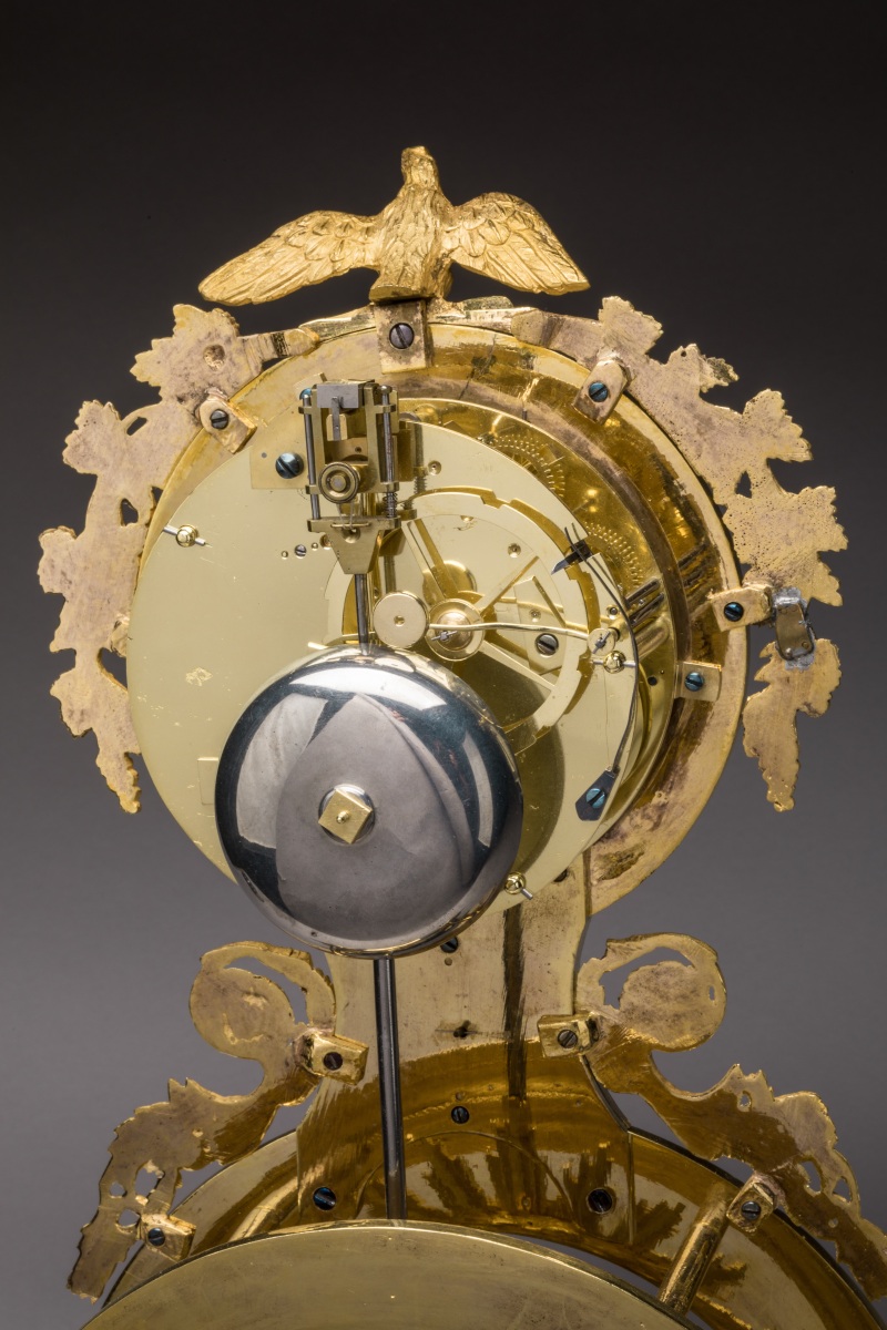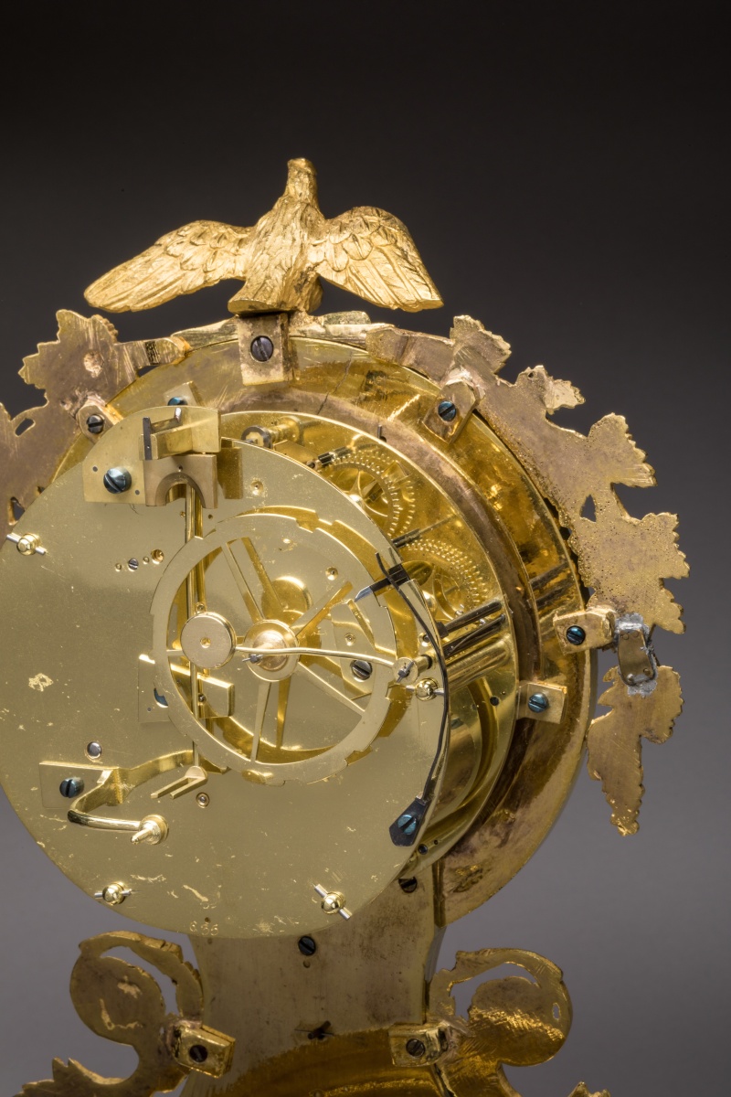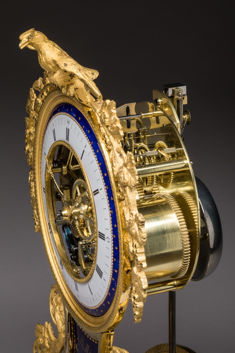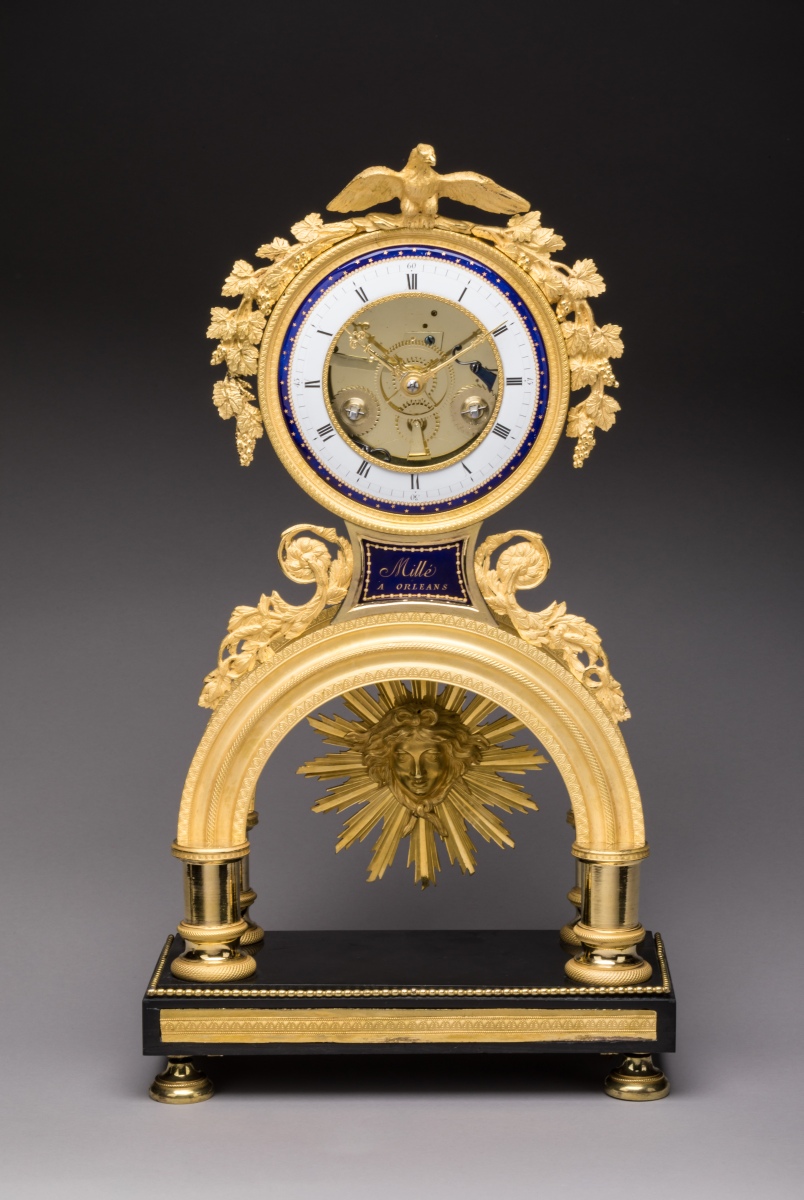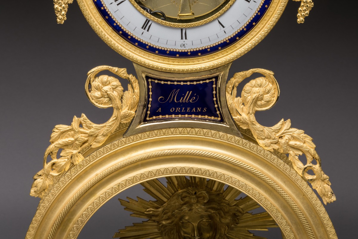 Le cadran émaillé blanc présente des chiffres romains pour les heures et des chiffres arabes pour les minutes. Il est cerclé d'émail bleu à semis d'étoiles d'or et est sommé d'un aigle aux ailes déployées. À ses côtés se déroulent des pampres de vigne et des grappes de raisin. Le mouvement repose sur une arcature à frise de palmettes et un cartouche émaillé et flanqué d'entrelacs feuillagés, signé MILLÉ à ORLÉANS. Le balancier est orné d'un masque d'Apollon rayonnant.