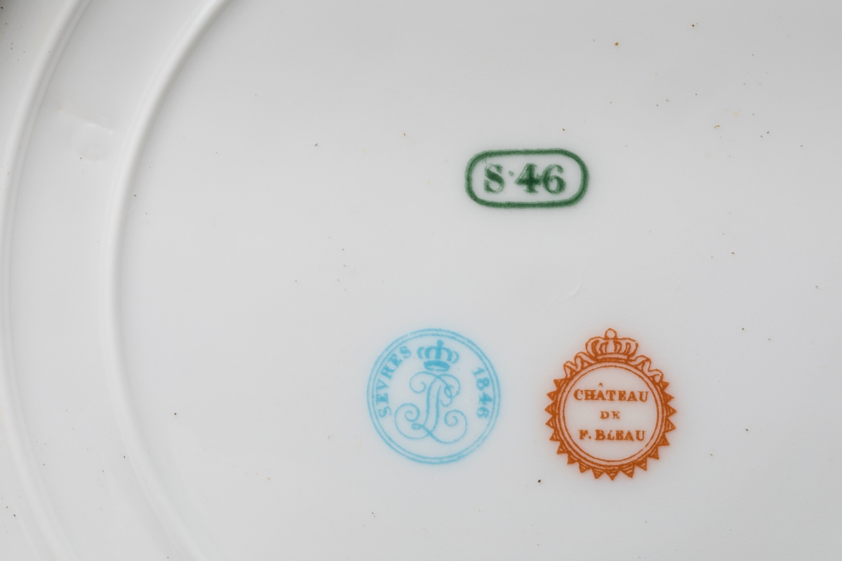 SÈVRES. A part of the SERVICE des CHASSES for the KING LOUIS-PHILIPPE, castle of FONTAINEBLEAU. Comprises 10 dinner plates and 11 dessert plates. Marked and dated from 1846 to 1876.