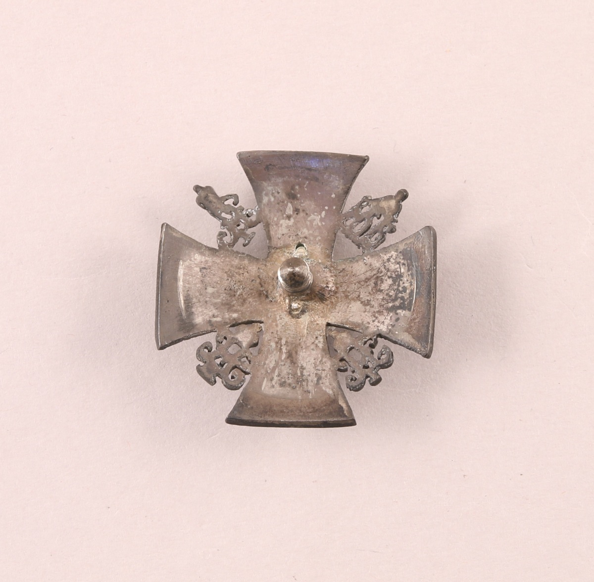 RUSSIE - INSIGNE DU RÉGIMENT DES GRENADIERS À CHEVAL DE LA GARDE IMPÉRIALE en forme de croix de Kulm (Croix de Fer) en métal argenté émaillé noir, chargée d'une grenade enflammée en métal doré, anglée des monogrammes des empereurs, Alexis Mikhailovitch, Alexandre Ier, Nicolas Ier et Nicolas II, fixation par vis et écrou.