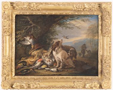 Nature morte au gibier près de chiens, avec un chasseur dans le paysage.