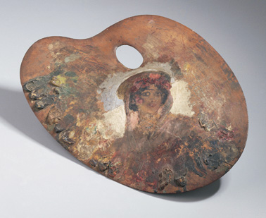 Palette du peintre, couleurs - et représentation d'une tête de jeune algérienne.