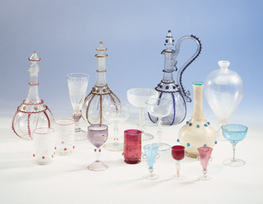 CARAFE en verre incolore avec anses arquées, bouchon. Décor en application de côtes et boutons pastillage.