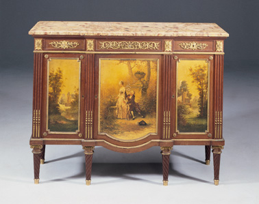 COMMODE à léger ressaut en acajou et placage d'acajou ouvrant à une rangée de trois tiroirs dans la partie supérieure et de trois portes dont l'une centrale cintrée - ornées de panneaux en vernis genre Martin représentant un couple dans le goût du XVIIIème dans un jardin, encadré d'une fontaine et d'un château. Trace de signature en bas à droite. Elle repose sur six pieds torsadés, sommets de chapiteaux ioniques. Montants cannelés et panneaux encadrés de filets de cuivre et bordures. Riche ornementation en bronzes dorés et ciselés d'entrelacs, guirlandes, écussons, gouttes d'eau, rosaces, acanthes... Intérieur soigné en placage d'orme. Dessus de marbre brèche d'Alep.