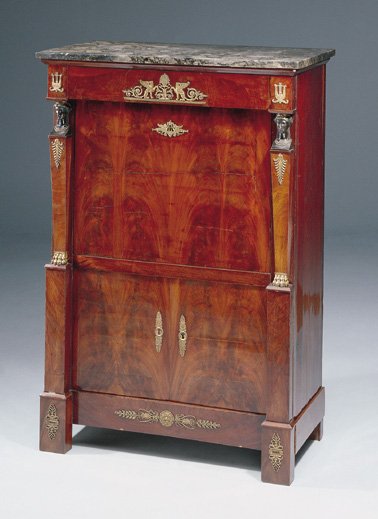 SECRÉTAIRE VERTICAL en acajou et placage d'acajou. Il ouvre à un tiroir, un abattant dissimulant un théâtre, à colonnes détachées, et dans la partie inférieure une double porte. Les montants à méplats sont ornés de figures de bronze à l'Antique à patine noire, se terminant à mi-corps par des griffes. Riche ornementation en bronzes dorés et ciselés de lyres, palmettes, griffons, et rosaces. Dessus de marbre gris et noir.