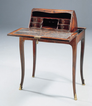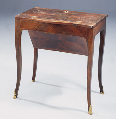 TABLE en placage de palissandre et bois de violette, formant BUREAU dit "CAPUCIN". Fermé, il a l'aspect d'une table ; ouvert, il constitue un bureau à gradin. Le dessus en volet se rabat vers l'avant découvrant un corps de gradin en quart de cercle qu'on lève manuellement. Tablette de pupitre inclinable, sur le dessus. Piètement cambré (accdts placage).