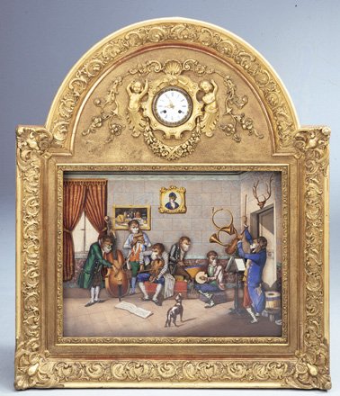 Dans un riche encadrement de style XVIIIème, PENDULE au mouvement signé THARIN, Paris, dans un cartouche feuillagé aux Amours.