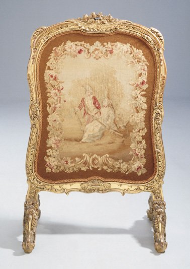 ÉCRAN DE CHEMINÉE, en bois richement sculpté et doré, au répertoire iconographique de la Rocaille: coquilles, rinceaux, acanthes, volutes. Motifs de tapisserie, couple de chasseurs.