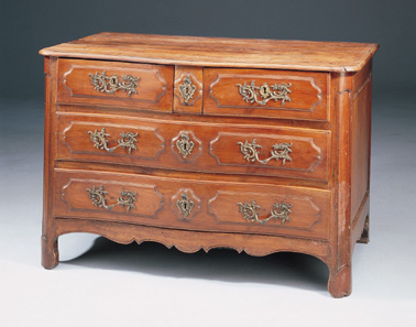 COMMODE en bois naturel mouluré, façade légèrement galbée. Elle ouvre par trois rangs de tiroirs dont deux dans la partie supérieure.