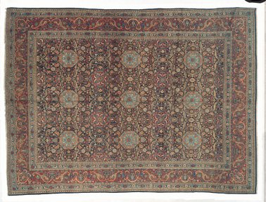 TAPIS KHORASSAN. Fond bleu marine à décor "hérati" turquoise, vert émeraude, vieux rose et brique. Deux bordures principales brique et vertes encadrées par neuf galons polychromes.