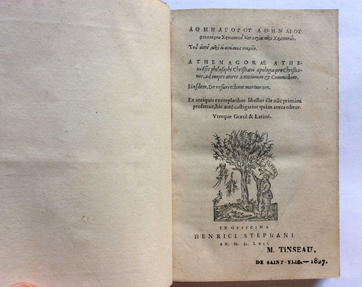 - Athenagoras: 208 pages. Edition princeps pour les deux textes, en grec, suivis d'une traduction latine de Gessner.