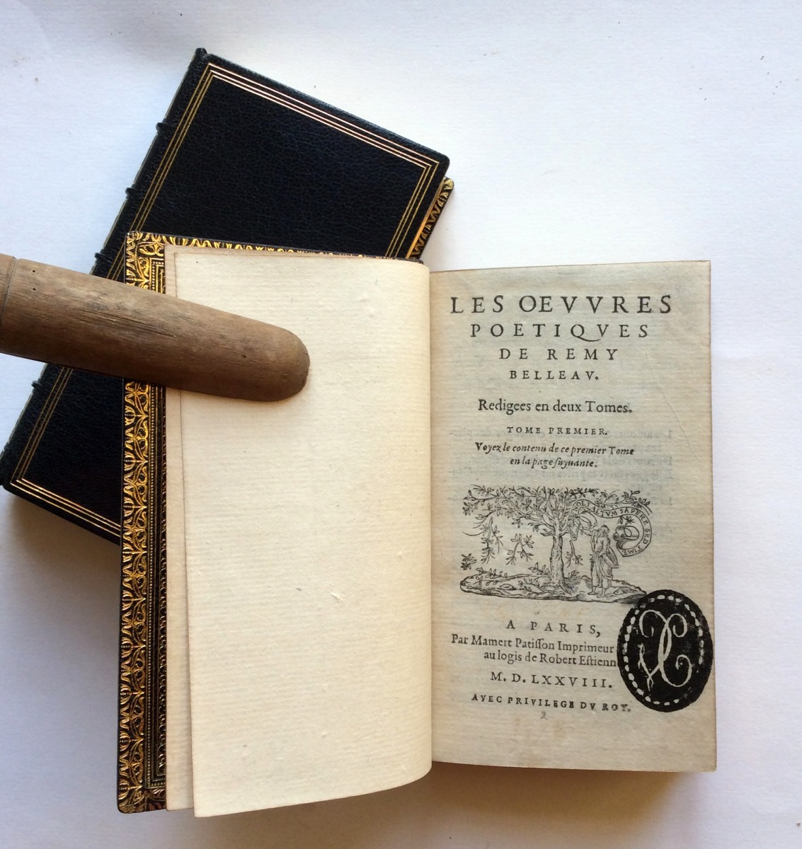 Première édition collective des oeuvres du poète, membre éminent de la Pléiade. Il est probable que l'éditeur de ces oeuvres soit Robert Estienne, à qui J. Paul Barbier attribue aussi la Préface. (J. Paul Barbier, La Pleiade, n°76)