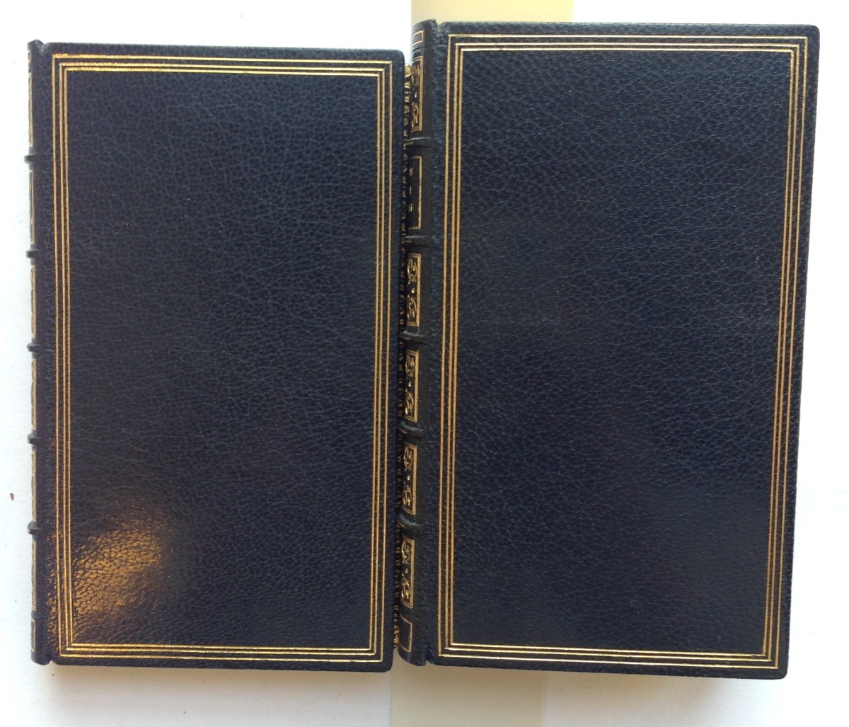 2 vol. in-12. 110 ff, (4 ff), 189 ff, (4 ff). 159 ff, (3 ff).Plein maroquin bleu nuit, triple filet d'encadrement, dos orné, filet sur les coupes ; dentelles intérieures. Tranches dorées. Exemplaire lavé. Reliures parfaitement établies, signées M. Godillot. (Cachet gras sur le titre du tome I. Le dernier feuillet de table du tome II est gilloté).