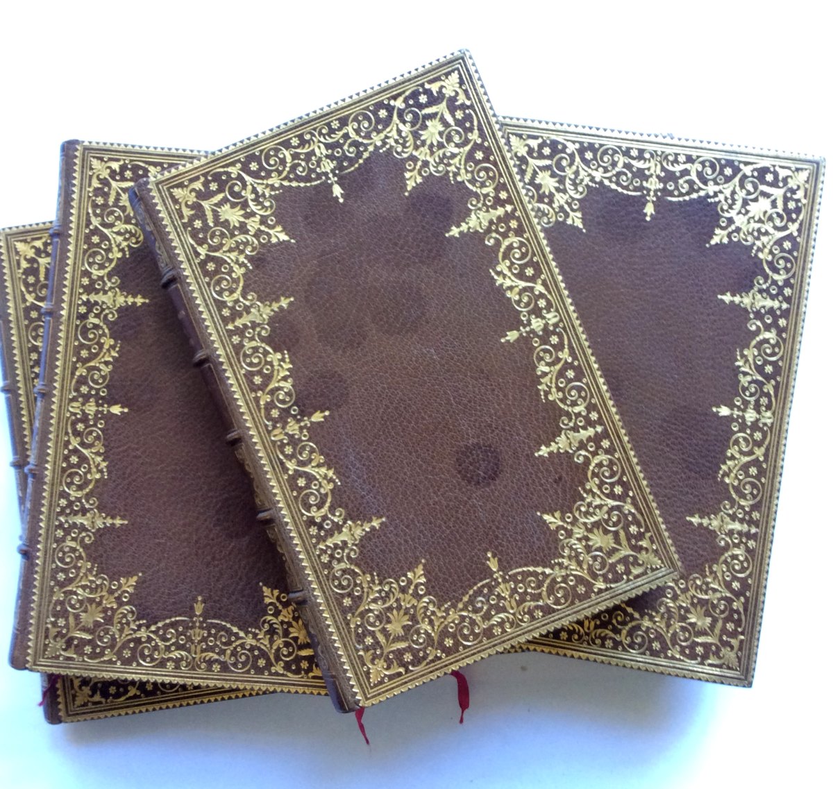 5 volumes in-8, plein maroquin havane à gros grains. Filets d'encadrement, dans lesquels s'inscrit une très riche dentelle frappée aux petits fers ; dos très orné. Filets droits sur les coupes. Large roulette intérieure ; triples gardes. Toutes tranches dorées. Exemplaire lavé. Reliure établie vers 1850, signée Petit, successeur de Simier. (Taches circulaires, légèrement plus foncées, sur tous les plats. ).