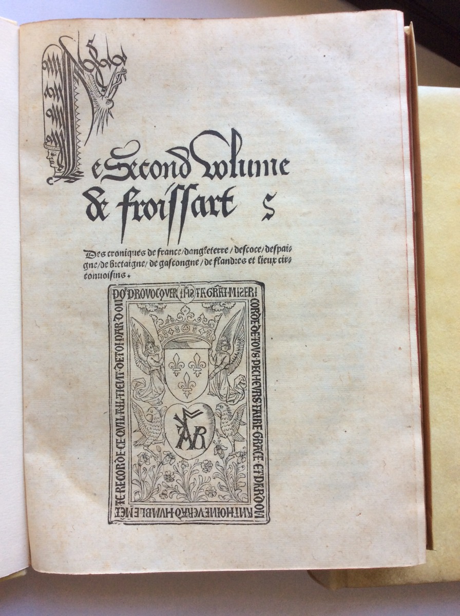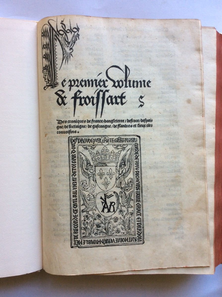 Cinquième édition (après 1495, 1499, 1505, 1514) de ces chroniques fondamentales pour la connaissance de la Guerre de Cent Ans, imprimée en gothique cursif. L'édition a été partagée entre Jehan Petit, Antoine Vérard, François Regnault. Tous les tomes de notre exemplaire portent la marque d'Anthoine Vérard (I, II et IV au titre et au dernier feuillet ; III au titre seulement). Seul le tome IV porte la date, au colophon.