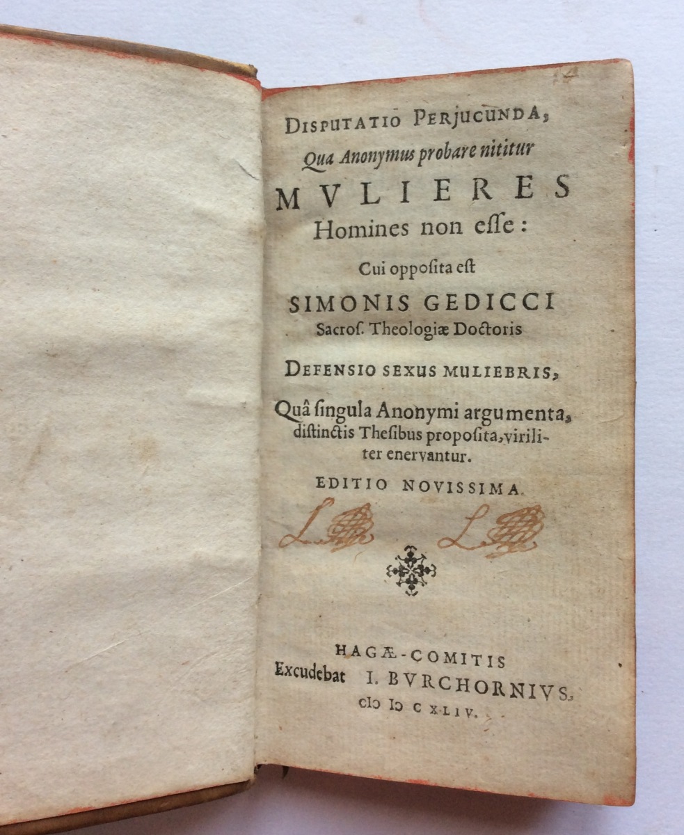 Disputatio perjucunda qua Anonymus probare nititur Mulieres homines non esse. Cui opposita est S. Gedicci ... defensio sexus muliebris.