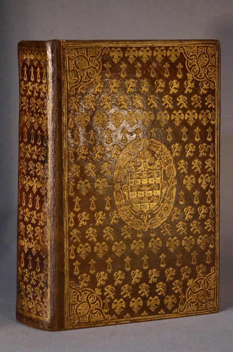 Maroquin brun, dos à cinq nerfs, plats ornés d'un triple filet doré, large fer à entrelacs aux angles ; semis d'hermines, de léopards et d'aigles bicéphales ; au centre, dans une couronne de fleurs, les armes de Charles Brisard-Tiville et ses pièces d'armes en semis alternés. Dos orné des mêmes pièces d'armes en semis ; tranches dorées. Reliure française du second quart du XVIIe siècle.