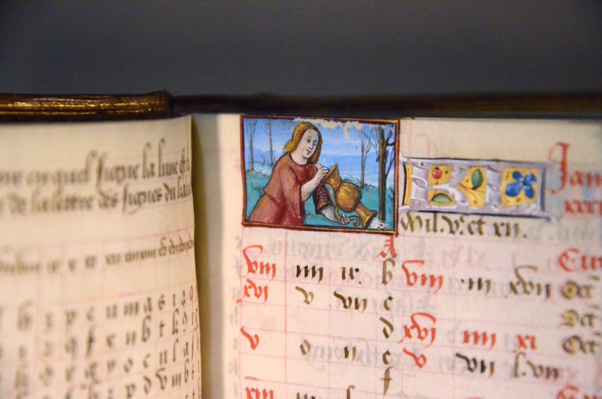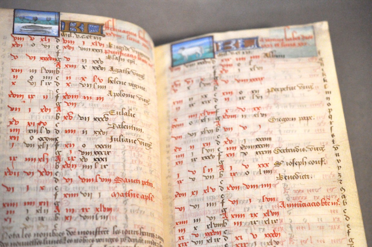 Fol. 2-7 v: Calendrier indiquant le nombre d'or sur trois colonnes (jours heures et minutes des nouvelles lunes ; sur les deuxième et troisième colonnes, les nombres rouges indiquent les heures ante meridiem et les nombres noirs, les heures post meridiem), la lettre dominicale, le nombre d'or de l'année 1512 (lui aussi sur 3 colonnes, selon le même principe), les fêtes liturgiques, la lettre-clé pour l'utilisation de la table du folio 1.