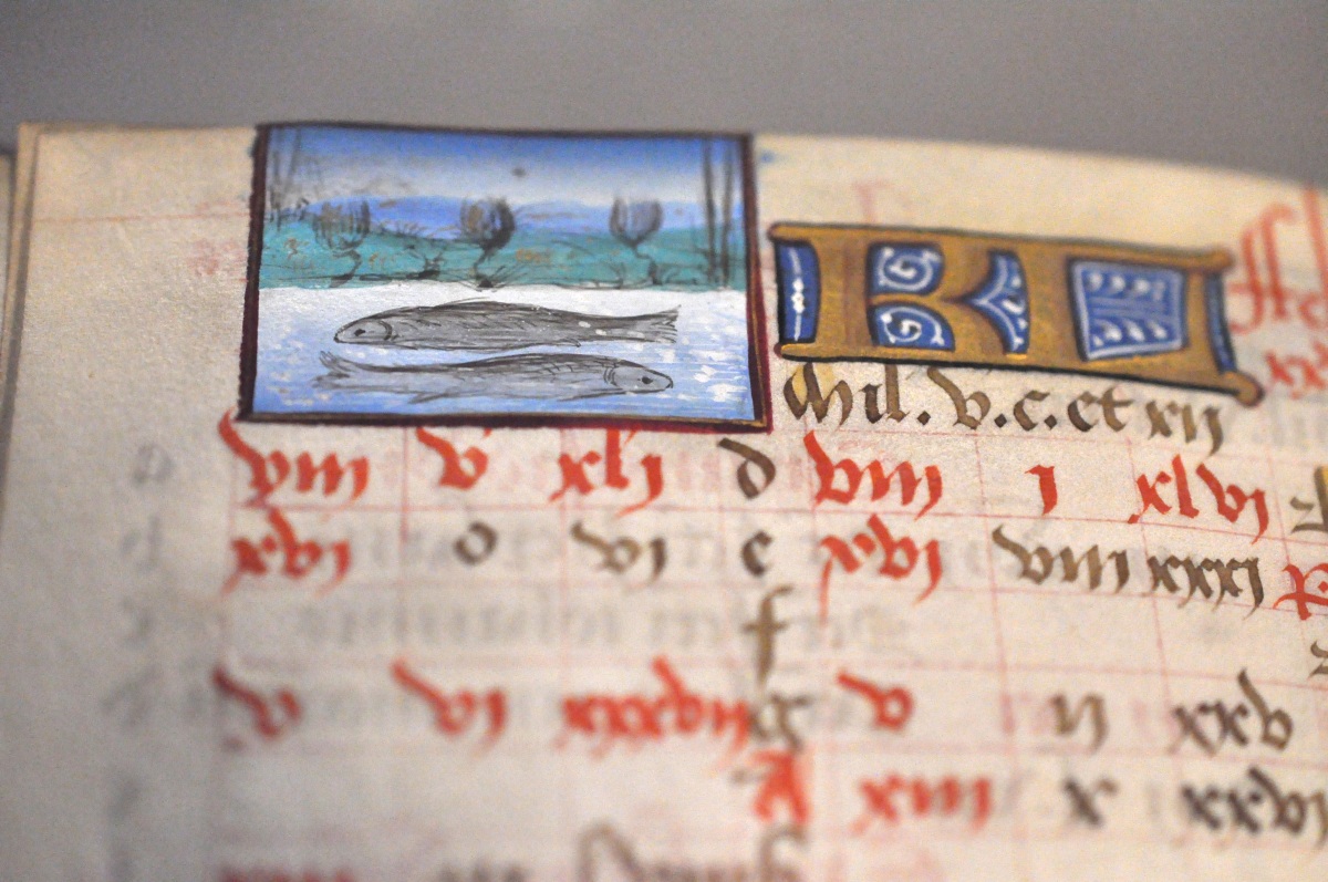 Huit initiales particulièrement ornées, aux pages enrichies de bordures blanches ou bleues sur fond rouge à filigranes d'or, avec inclusions d'or et motifs floraux, d'une hauteur de quatre lignes d'écriture. Au folio 12, une importante initiale B comportant le monogramme DI en lettres peintes. Bouts de lignes à la gouache bleue, rouge ou brune rehaussée de filigranes d'or. Les fol. 12, 39, 57, 73v, 89v, 109v, 128v, 149 sont enrichis d'une magnifique composition à thèmes de fleurs, de fruits, d'animaux fantastiques et rinceaux.