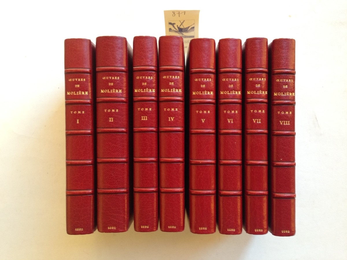 Très bel exemplaire, parfaitement établi par Bernasconi, de la première édition collective complète des oeuvres de Molière, contenant six pièces en éditions originales: Don Garcie de Navarre, L'Impromptu de Versailles, Don Juan ou le festin de Pierre, Melicerte, Les Amours magnifiques, et La Comtesse d'Escarbagnas.