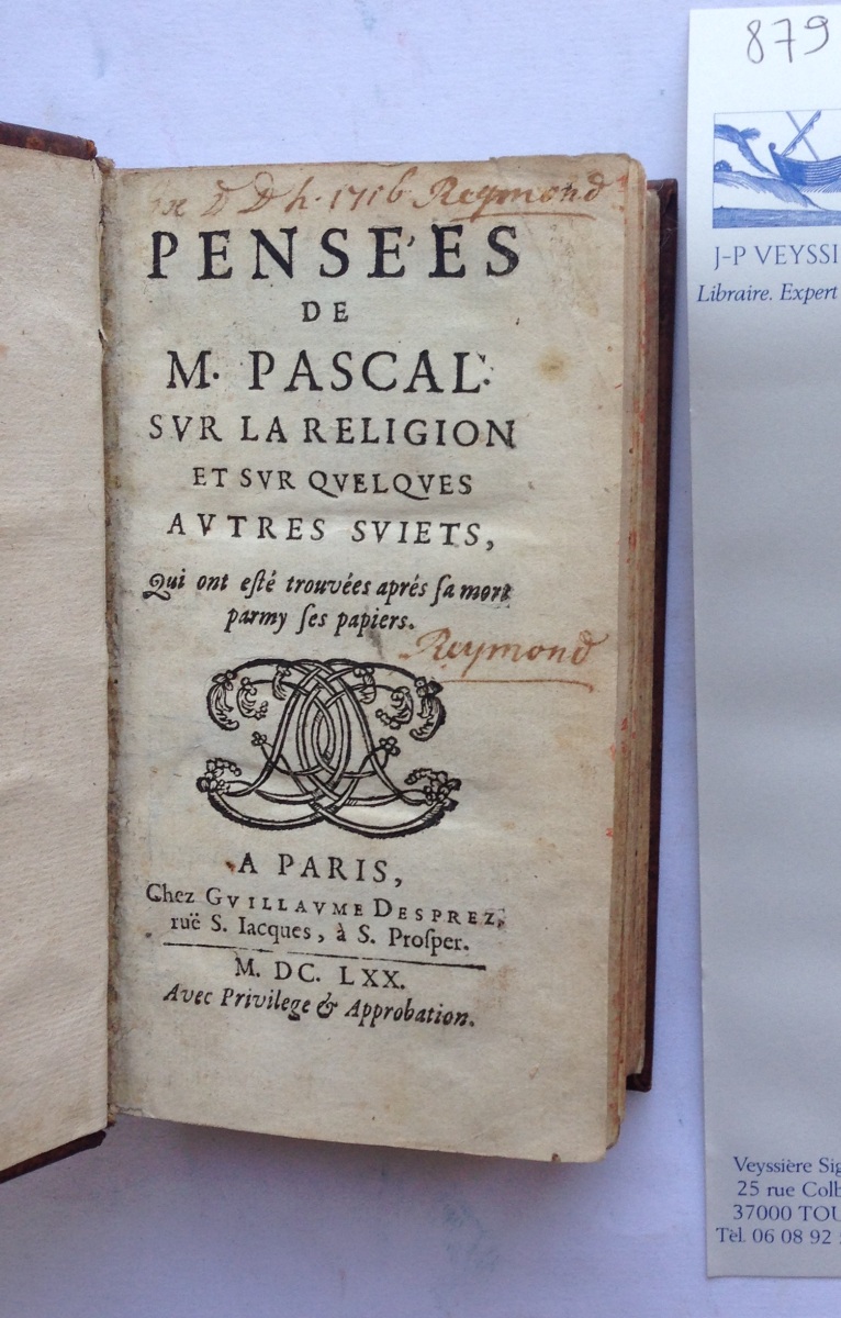 Il n'existe que deux exemplaires des Pensées, éditions préoriginales, portant la date de 1669: un à la Bibliothèque Nationale, et un à la Médiathèque de Troyes, portant quelques rares variantes. Cette contrefaçon, qui porte en tête du texte un bandeau gravé sur bois et non pas un cuivre, est conforme pour le texte à l'exemplaire de Troyes, comme tous les exemplaires achevés d'imprimer en janvier 1670.