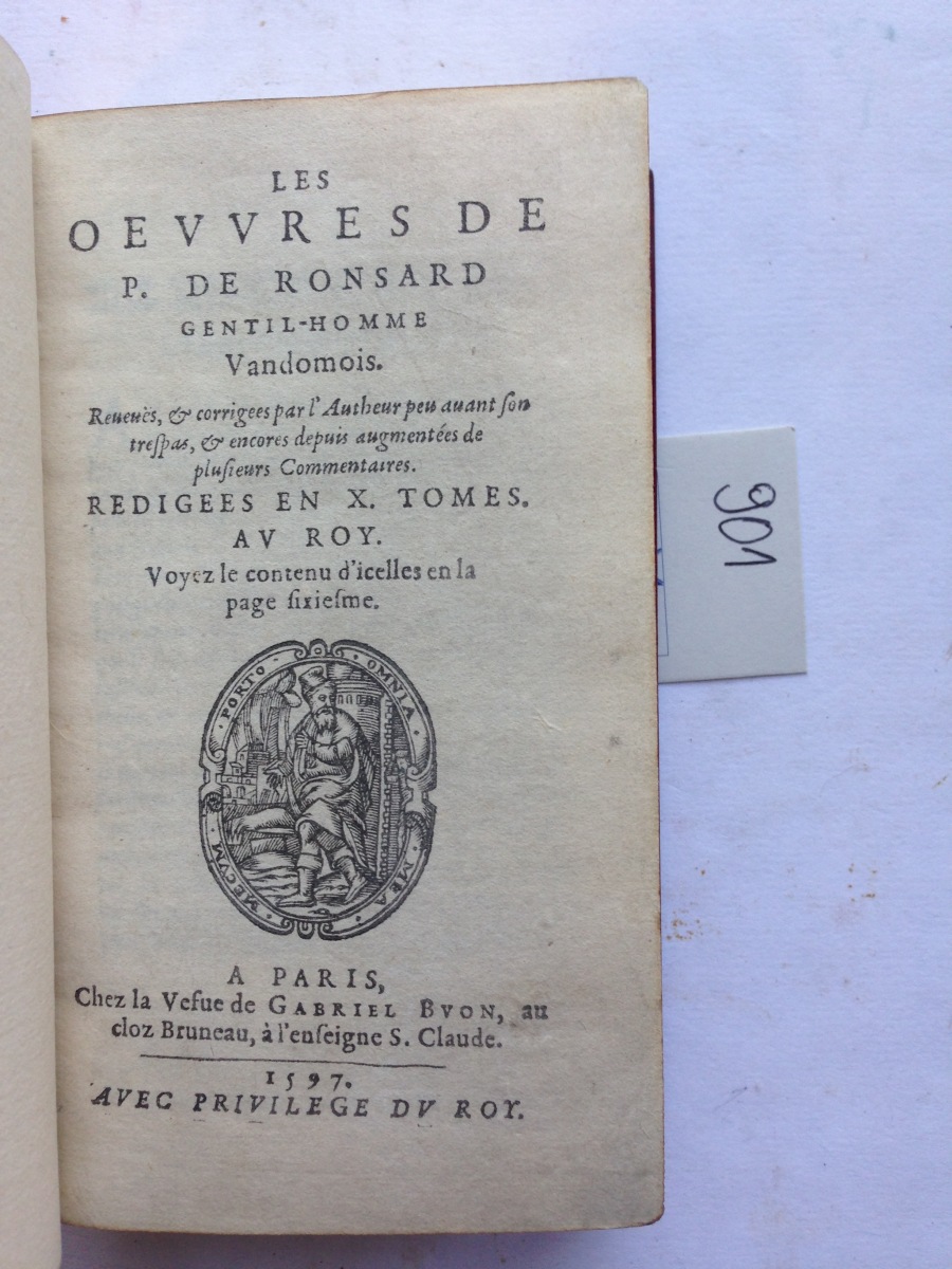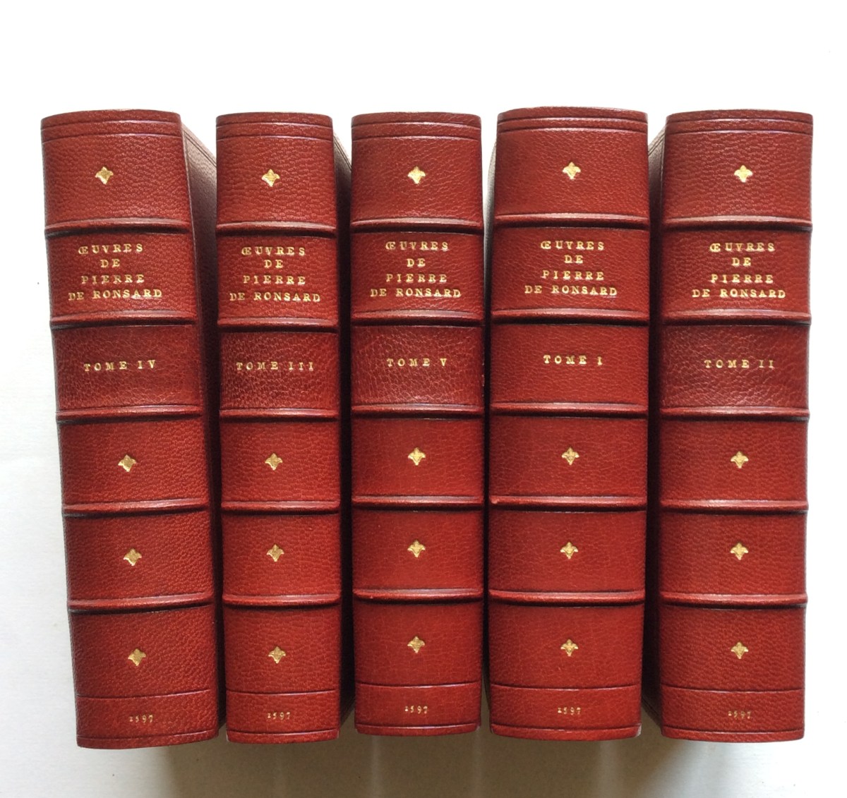Neuvième édition collective, et troisième édition posthume. Elle est imprimée par Léger Delas en caractères italiques pour les vers, et romains pour la prose. Elle est illustrée des portraits gravés sur bois de Ronsard, Muret, Henri II, Charles IX, Henri III et le duc d'Anjou, par Jean Cousin. Conformément à la description de J.P. Barbier, le 10ème et dernier tome n'a qu'un faux-titre, sans date et sans nom d'éditeur. (Barbier, Volume Ronsard, n°60, pages 208 à 217).