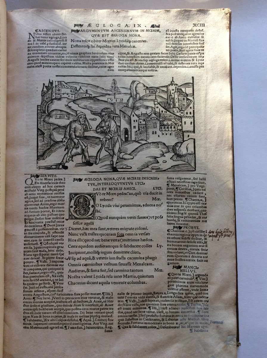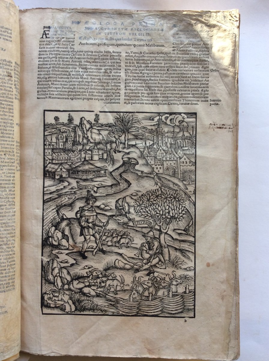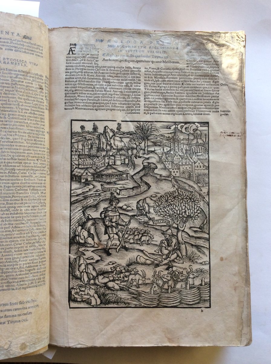 Très belle édition des Oeuvres de Virgile, illustrée de plus de 200 remarquables bois à mi-page ou 1/3 de page, pris dans l'édition lyonnaise de Virgile publiée par Jacques Sacon en 1517, qui les tenait de l'édition strasbourgeoise de Grüninger de 1502, donnée par Josse Bade. Exemplaire modeste d'un des monuments des livres illustrés de la Renaissance.