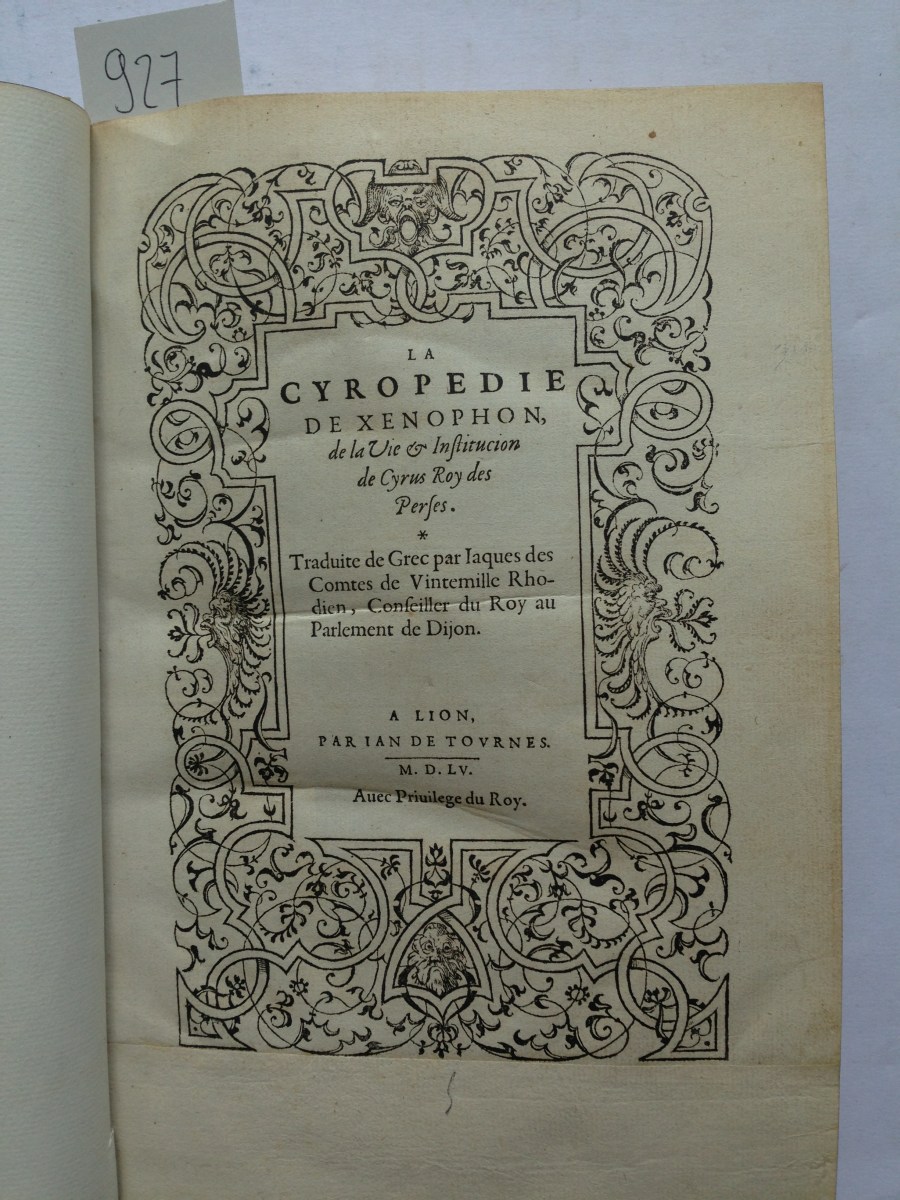 La Cyropédie de Xénophon, de la Vie et Institucion de Cyrus, Roy des Perses. Traduite du Grec par Iaques des Comtes de Vintimille, Rhodien.