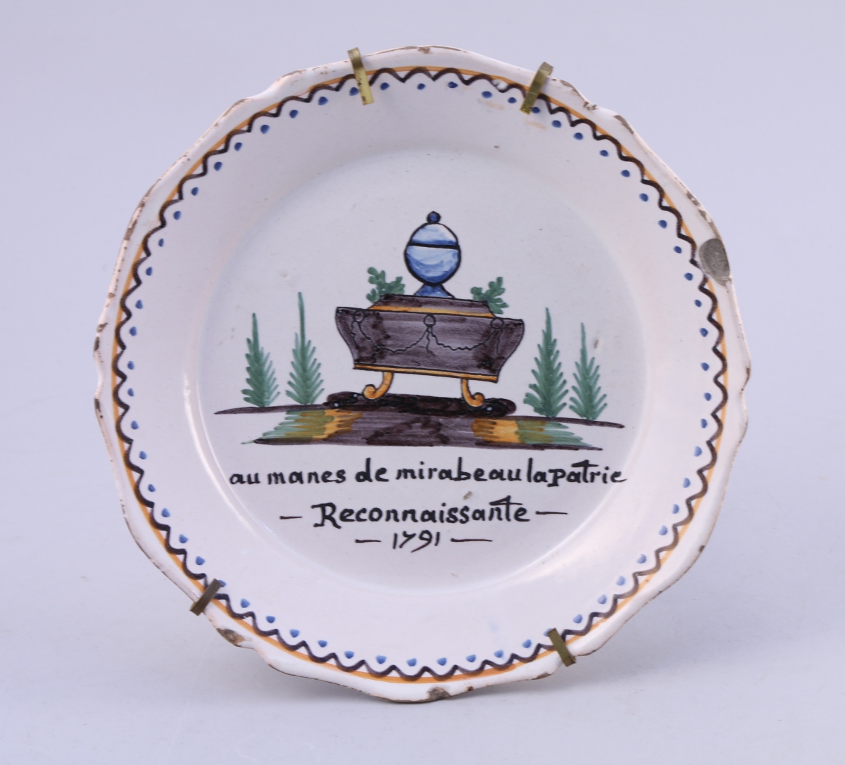 NIVERNAIS, faïence. ASSIETTE portant au centre l'inscription "Aux mannes de Mirabeau la Patrie reconnaissante". Datée 1791. Époque révolutionnaire.