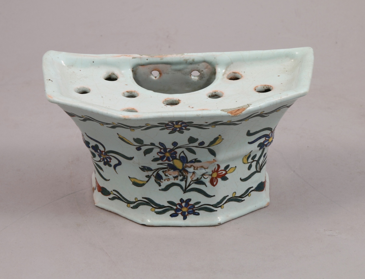 ROUEN. BOUQUETIÈRE d'applique à pans coupés en faïence polychrome à décor de fleurs.