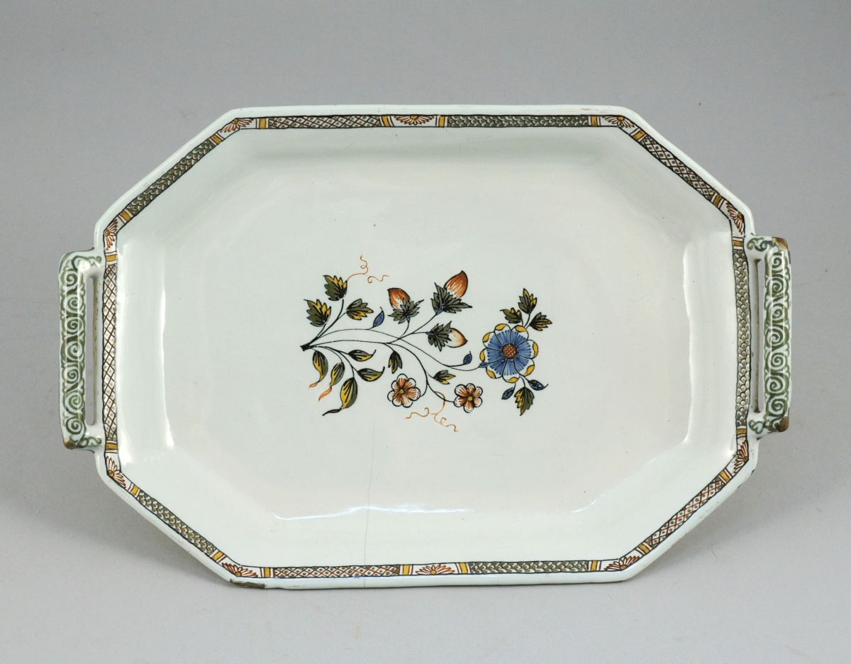 ROUEN. BANNETTE rectangulaire à pans en faïence à décor polychrome floral, anses latérales à motifs de volutes. XVIII-XIXe.