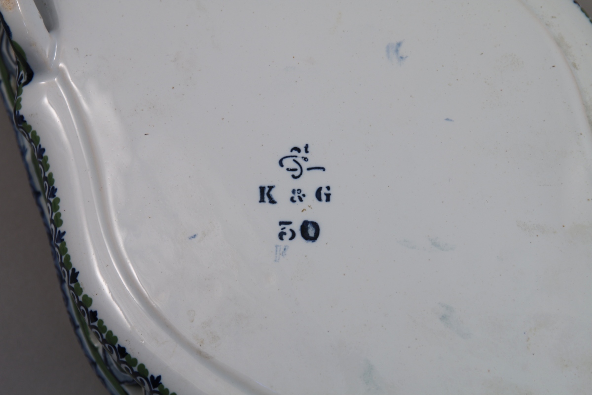 SAINT-CLÉMENT. JARDINIÈRE de forme oblongue à anses fixes en faïence polychrome. Les bords ajourés chantournés. Le fond à décor d'un paysage lacustre. Piètement quadripode. Marque au revers "K & G" pour Keller et Guérin.