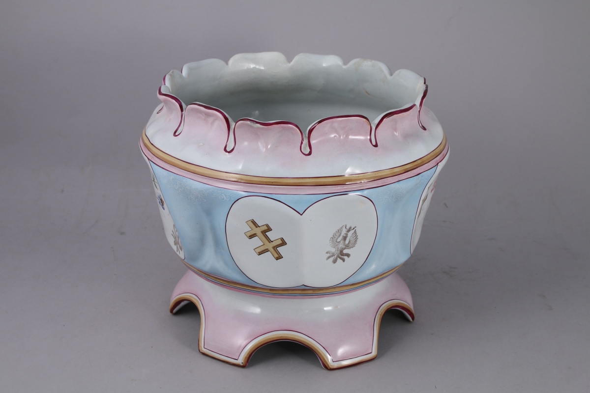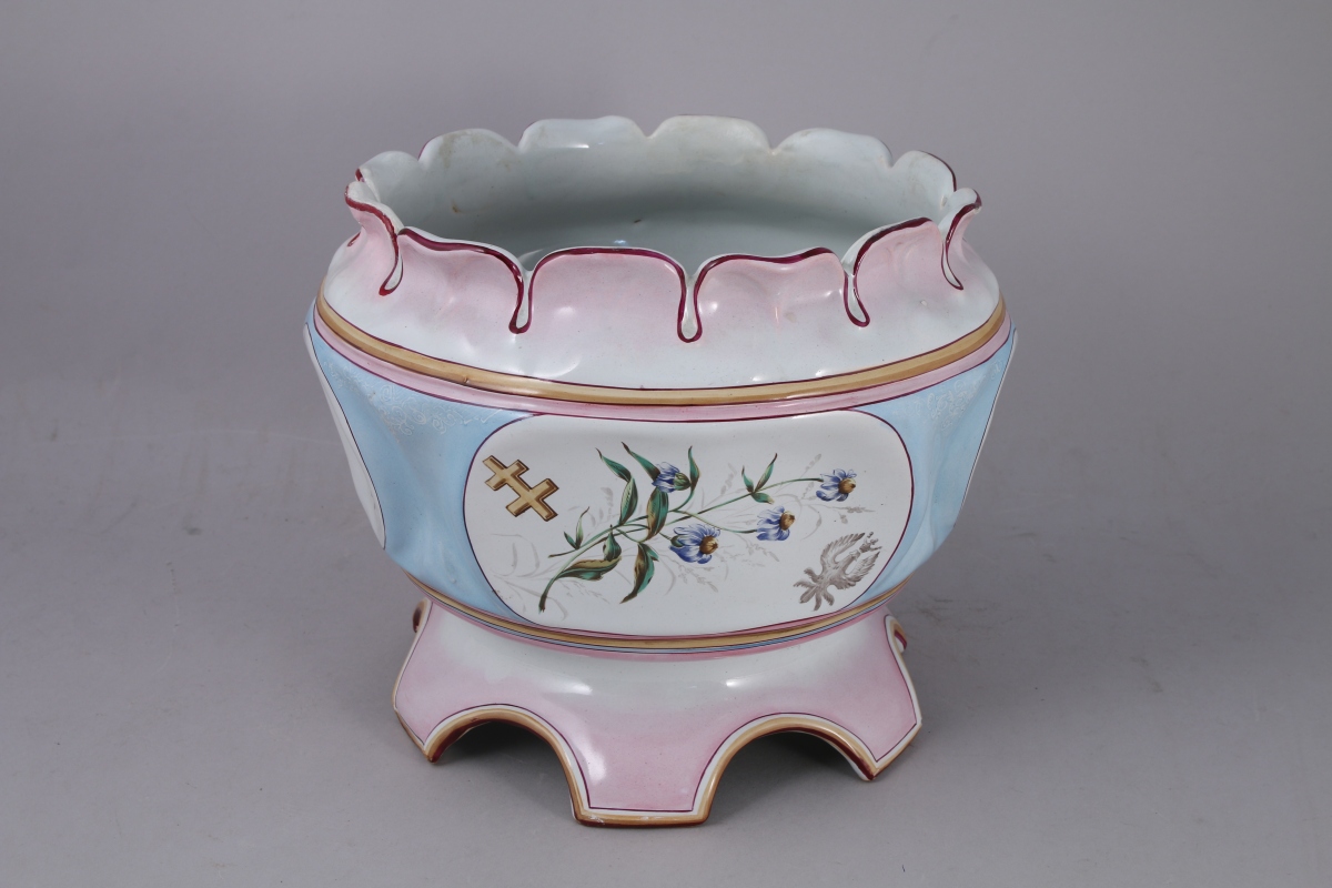 SAINT CLÉMENT. KELLER et GUÉRIN. JARDINIÈRE circulaire à col évasé et mouvementé en faïence polychrome, à décor de symboles lorrains tels que chardons, croix de lorraine, alerions et fleurs dans des cartouches. Elle repose sur six petits pieds en arcades. Marqué au revers "SCT K.G".