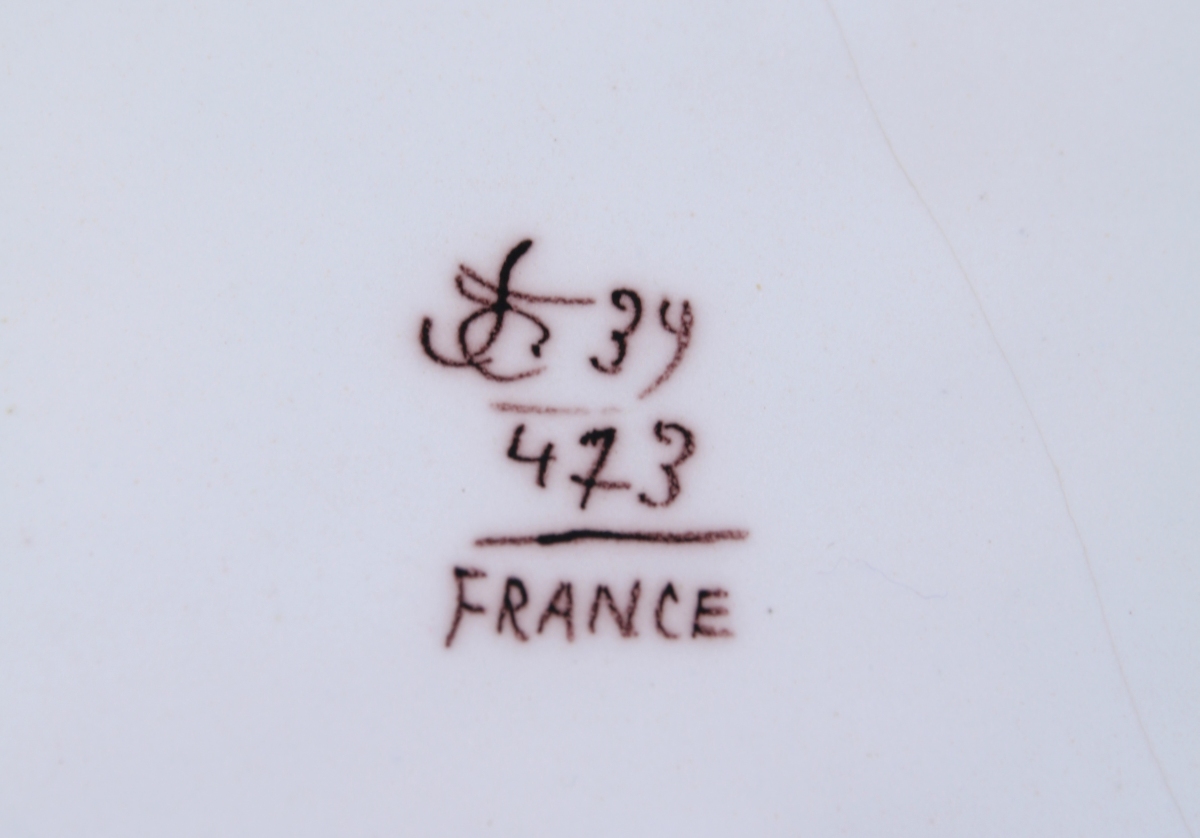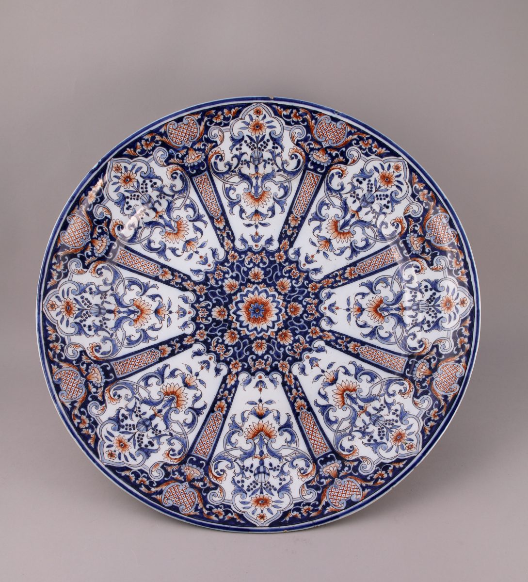 - DESVRES, PLAT à décor bleu et rouge de lambrequins rayonnants dans le goût de Rouen. Signé au dos "FC 39 473 FRANCE" pour FOURMAINTRAUX.