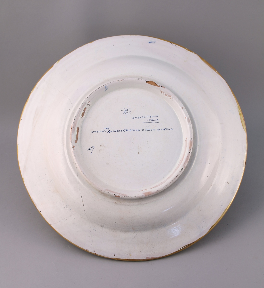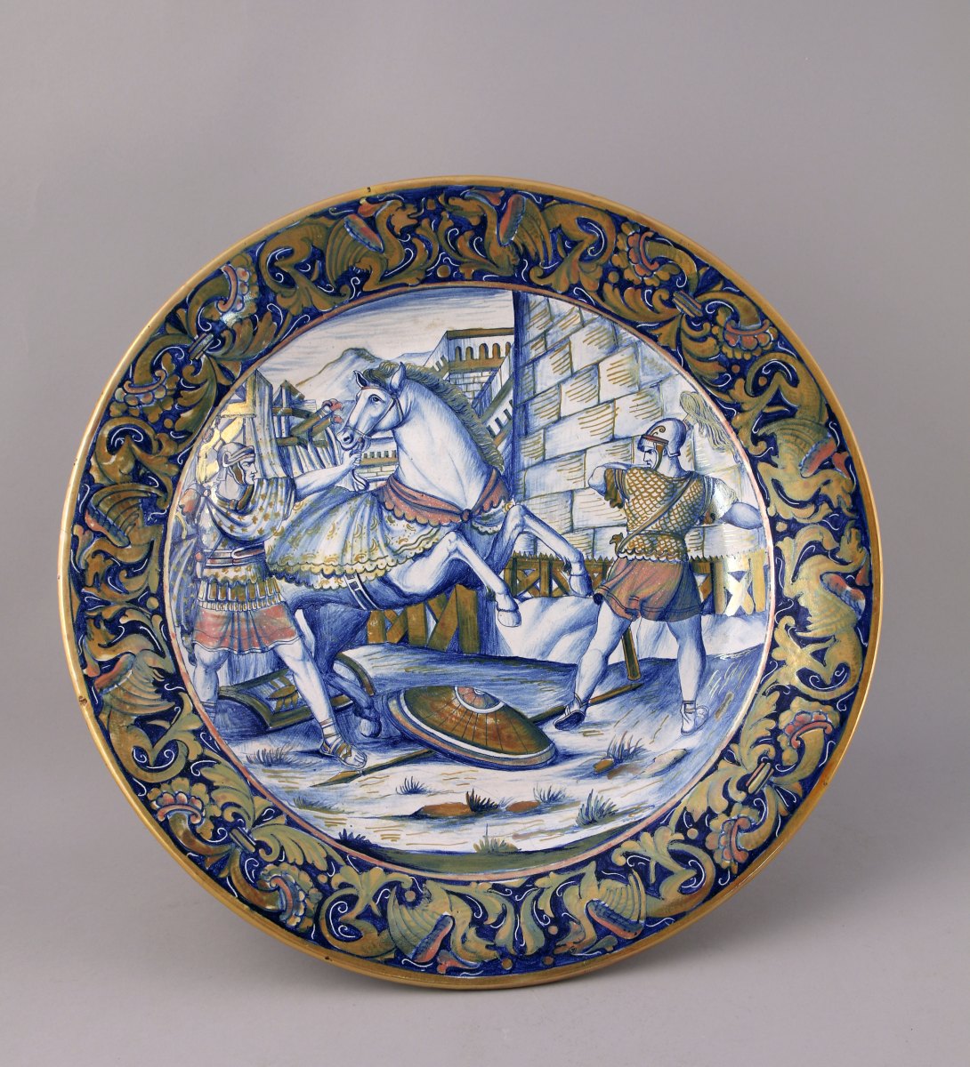- GUALDO TADINO. PLAT à lustre métallique à décor d'une scène classique de légionnaires romains dressant un cheval. Frise de grotesques alternant griffons et cornes d'abondance. Signé au dos "Gualdo Tadino, italia" et "Duello tra Quinzio crispino e badio di Capua, Richi".